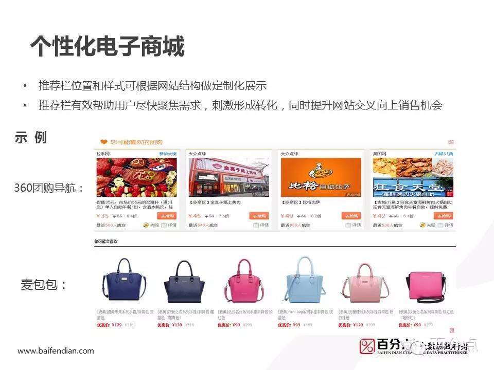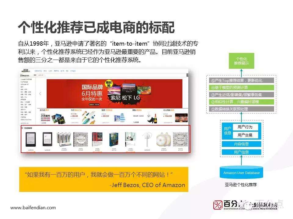大数据驱动下的电商个性化推荐(PPT) 更多阅读:大数据时代的电商–信息图Amazon Personalize个性化推荐在亚马逊云科技中国区域上线Amazon和Netflix的个性化推荐是如何工作的?Econsultancy:电商网站推荐的6大玩法蝉妈妈&蝉魔方:2024抖音电商双11大促复盘报告PDD:疫情期间初心不改 强劲补贴用户和商家 业绩增长快亏损也大电商数据挖掘之关联算法QuestMobile:2020儿童经济洞察报告 线上线下儿童经济加速闭环 种草成消费驱动器知微:618电商大促微博营销效果数据分析2022年德国电商市场报告电商APP鏖战“双十一”:DAU、购物车、确认订单、支付订单数详解米汇:2018年3-5月份电商短视频营销分析报告联邦快递全球枢纽:全球最大快递如何应对电商时代挑战?ASO100:2016年2月电商 App 竞争报告2013年化妆品行业七大电商网络营销趋势