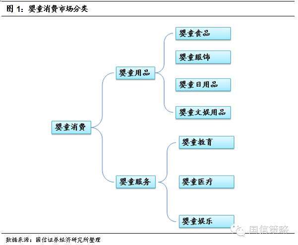 而在我们梳理的A股上市公司“新消费”图谱中(详见《美丽、健康、愉悦——人口结构变迁下的“新消费”趋势》,2016.01.05),我们对“婴童消费”的定义是以0-12岁的婴童为消费主体,主要分为婴童用品和婴童服务两大类消费品,婴童用品主要包括婴童食品(包括奶粉、辅食、儿童乳制品、儿童营养保健品等)、婴童日用品(包括洗护用品、纸尿裤、婴童家居出行用品等)、婴童服饰(婴童服装、婴童鞋帽等)、婴童文娱用品(包括婴童玩具、婴童可穿戴电子设备、婴童书籍及音像制品等);婴童服务主要包括婴童教育(如胎教、早教、课外培训教育等)、婴童医疗、婴童娱乐(动漫影视、亲子旅游、婴童摄影)等。