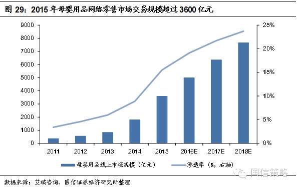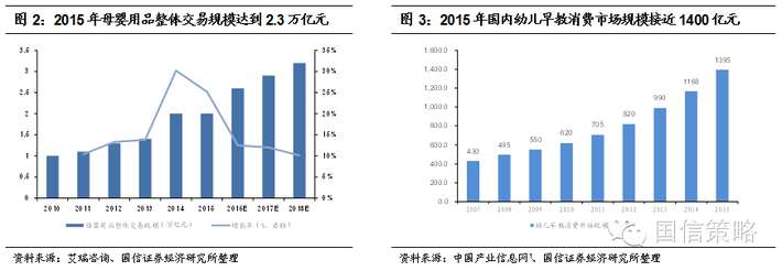 婴童用品市场交易规模在万亿级别。根据艾瑞咨询发布的《2015年中国线上母婴市场发展白皮书》,2015年母婴用品整体交易规模达到2.3万亿,占社零总额比例为7.9%。由于母婴用品中妈妈用品占比较小,而婴童用品的内涵更大,因此我们估计2015年婴童用品的市场交易规模超过2万亿元。
