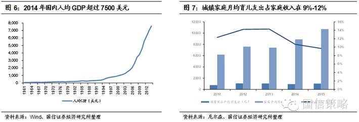 婴童服务市场空间潜力更大。婴童服务的内涵更广,包括婴童教育、儿童动漫影视、亲子游、婴童摄影服务、婴童健康服务等等。以婴童教育为例,根据中国产业信息网的调查显示,近6成的家长把孩子教育投资列在首位,35%的城市家庭每月在孩子身上的早期教育费用支出在500-1000元,10%的家庭每月用于孩子的教育费用支出高于1000元/月。庞大的早教需求,致使早教行业规模逐步扩大,早教机构遍地开花,整个市场的规模在2015年达到1400亿元左右。在消费升级的趋势下,内涵更广的婴童服务的市场空间潜力广阔。