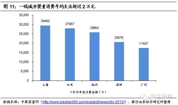 婴童消费支出为家庭刚性支出,一般家庭月均育儿支出在900-1000元,占家庭收入9%-12%,一线城市支出规模更大。2015CBME中国孕婴童消费市场调查报告显示,一、二线城市受访家庭月均收入为9606元,月均育儿支出是1012元(不包括教育等婴童服务类支出),占家庭月均收入的11%,受不同城市收入和消费水平影响,婴童消费支出占比在9%-12%。而另一项针对一线城市的调查显示,一线城市家庭年均婴童消费支出超过2万元,占家庭日常消费支出的28%(不含房贷)。婴童消费具有刚性、高频、高客单价的特点,随着对消费品质的追求,预计未来消费金额将稳步上升。