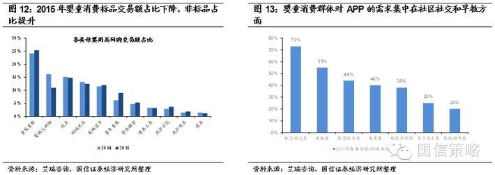 过去婴童消费主要集中在婴童用品类,并且主要以奶粉和纸尿裤为主。各大电商也将奶粉、纸尿裤、辅食等作为标配。但除了传统的婴童用品外,目前父母对于益智类教育、玩具、运动、亲子游以及用于记录婴童成长的摄影写真等婴童服务需求也不断上升。而从商家的角度看,奶粉、纸尿裤这类刚需标品的价格竞争激烈,而童装、玩具、洗护用品等非标品更有利于增强客户粘性。根据艾瑞咨询,2015年婴幼儿奶粉的交易额占比为11%,较2014年下降了5.2%;各类母婴用品的交易情况渐趋分散,婴童辅食、洗护日化用品以及喂养工具等偏长尾的品类占比均较2014年有所上升。同时,父母对婴童教育、娱乐、医疗等服务类需求的提升,将促使婴童服务成为婴童消费市场的蓝海。