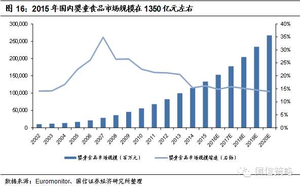 婴童食品以奶粉和辅食为主,2015年市场规模在1350亿左右。广义范围看,婴童食品包括奶粉、辅食、糖果、儿童乳制品、儿童营养品等。狭义范围看,婴童食品以奶粉和辅食为主,消费人群为0-3岁的婴幼儿,其中奶粉占比达到9成。随着营养观念的提升,对于婴童营养辅食的需求也不断上升。根据Euromonitor,2015年国内婴童食品(以下提及的“婴童食品”均为狭义范围)的市场规模在1350亿左右,至2020年有望超过3000亿元,年复合增速有望达到15%。