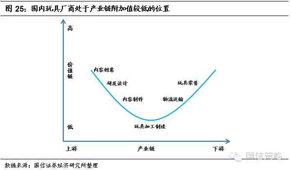 行业龙头开始转型,从单纯玩具制造向内容创造和研发设计升级。从国际玩具品牌的发展经验看,玩具产业链“微笑曲线”的两端分别为内容创造和研发设计。内容创造主要以动漫、游戏、电影等IP链的衍生来树立玩具品牌,主要代表有迪士尼;研发创造则通过专注于玩具的设计、开发,对玩具的外形和功能进行创意加工,推动产品升级,主要代表有乐高。目前国内上市企业中奥飞动漫、骅威股份、群兴玩具等都在积极往价值链的两端提升。