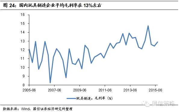 国内婴童玩具厂商以加工制造出口为主,产品附加值低。婴童文娱用品包括婴童玩具、婴童书籍及音像制品等,其中玩具是婴童消费群体的主要娱乐用品。国内的婴童玩具厂商以加工制造出口为主,2015年玩具出口金额达到157亿元,并且集中在广东、江苏、浙江、上海、福建等省市。但是由于国内玩具厂商以OEM生产为主,产品附加值低,近三年规模以上玩具制造企业的平均毛利率仅13%,而国际玩具龙头公司乐高2014年的毛利率高达72%。