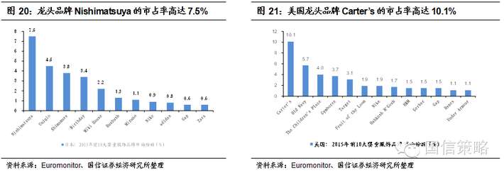 从日美市场看,品牌化趋势下的行业集中度提升是未来国内婴童服饰的发展方向。从日本和美国的婴童服饰市场看,二者的行业集中度明显高于中国。日本的婴童服饰行业中,2015年前3大品牌Nishimatsuya、Uniqlo、Shimamura的市占率超过15%,龙头品牌Nishimatsuya的市占率高达7.5%。在美国市场,2015年前3大品牌Carter’s、Old Navy、The Children’s Place的市场份额占比接近20%,龙头品牌Carter’s的市占率高达10.1%。目前,国内婴童服饰市场中除了龙头品牌巴拉巴拉的市占率达到4%,其余品牌的市占率均不到1%,并且前10大企业的市场份额占比在10%左右。从日美市场的经验看,当前我国的婴童服饰仍处于群雄逐鹿的行业高度竞争的阶段,大部分婴童服饰处于无品牌状态。随着未来消费者对于婴童服饰品牌和设计的重视度提升,国内婴童服饰将往品牌化发展,并且在这一个过程中,行业集中度将会有所提升。