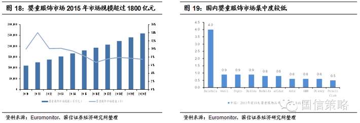 婴童服饰2015年市场规模超过1800亿,但行业极度分散。根据Euromonitor,2015年婴童服饰的市场规模超过1800亿元,到2020年市场规模将达到2500亿元以上。但从行业集中度看,除了龙头品牌巴拉巴拉市占率达到4%以外,其余前10大品牌的市占率均在1%以下,行业呈高度分散状态。目前除了国内服装企业进军童装领域外,外资品牌如H&M、Zara、无印良品、优衣库等快时尚品牌均丰富了童装品种,Gucci、Dior等品牌开始在国内布局童装零售网络,开设童装旗舰店。