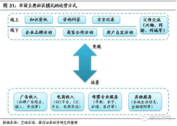 行业发展迅速,但同质化问题显现,龙头企业谋求多元变现。从发展路径看,两家龙头企业妈妈网和宝宝树分别上线于2004年和2007年,这一时期也属于母婴网站从起步到稳步发展的阶段;随后,2012年专做移动端的辣妈帮上线,主要母婴网站也相继推出APP,行业进入快速发展的阶段。但是无论从移动端还是PC端看,社交资讯模式的同质化现象较为严重,企业竞争力在于提高客户粘性和实现多元渠道变现。目前主要企业在夯实社区内容服务的基础上,通过布局电商和拓展线下婴童服务,如早教、亲子游乐等,来谋求用户沉淀和多元变现。