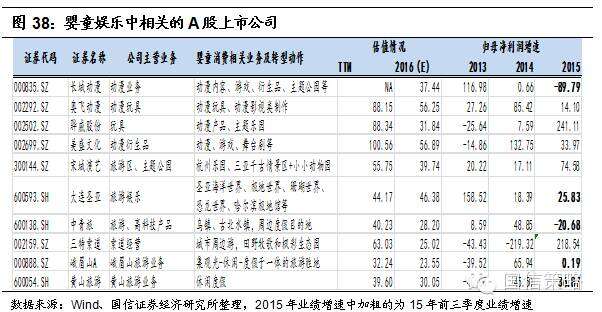 婴童娱乐涉及范围较广,主要包括动漫影视、亲子旅游等方面,行业整体呈高景气态势,我们认为全产业链运营类和细分领域专注类公司相对更具竞争力。建议关注A股中的奥飞动漫、美盛文化、宋城演艺、大连圣亚等。同时我们梳理了A股中涉及婴童娱乐的相关上市公司,供投资者参考,不做投资建议。