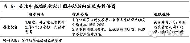 3)婴童教育:兼具投资属性,重视度提升,行业未来5年增速15%-20%;关注中高端特色幼教机构和提供优质幼教内容的提供商,如秀强股份/皇氏集团。