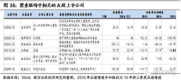 总体来看,目前婴童服饰竞争日趋激烈,在行业规模增速日趋稳定、消费者对于品牌和设计的重视度逐渐提升的情况下,相对来讲,品牌占有率高、渠道渗透力强和创新服务模式的龙头企业更具投资价值,建议关注A股中的森马服饰。同时我们梳理了A股中涉及婴童服饰的相关上市公司,供投资者参考,不做投资建议。
