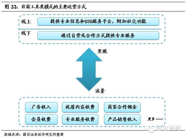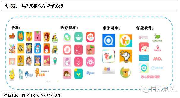 运营模式以线上提供内容、线下提供专业服务为主,广告、会员收费、商家佣金等为主要变现模式。从各类婴童消费的工具类APP来看,主要的运营模式是通过线上提供内容来获取客户,例如婴童的健康资讯、在线问诊的医疗服务、早教产品、婴童成长记录、亲子游乐活动信息等;在线下则通过自营或者合作提供相应的医疗、早教、儿童摄影、休闲娱乐等服务。从变现模式看,主流的变现方式依然是广告收入。目前多数工具类应用以免费为主,但也有部分提供会员收费服务和优质内容收费服务。此外,通过和线下商家的合作也获得一部分佣金收入。