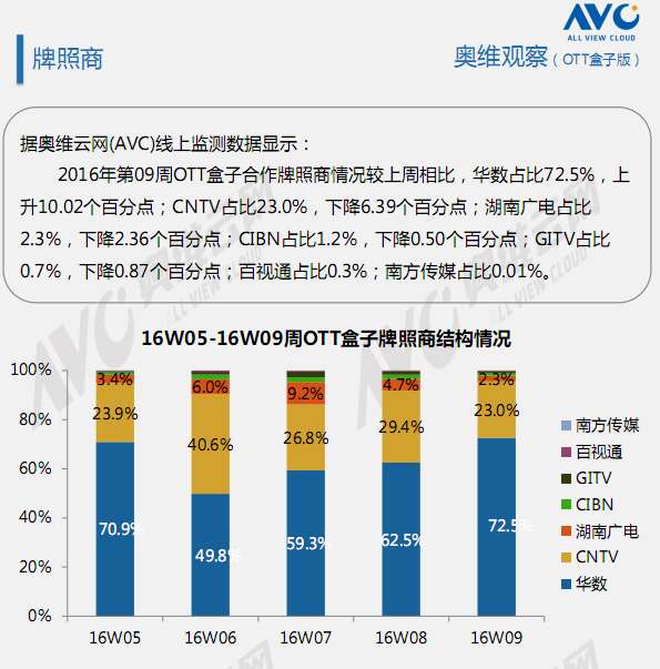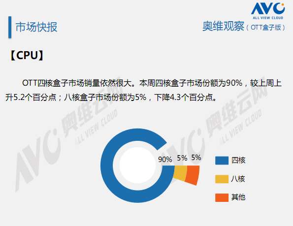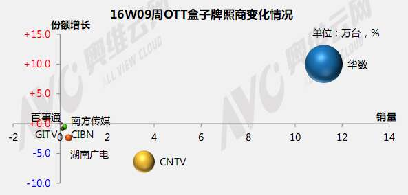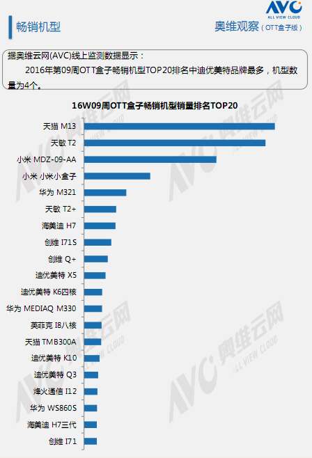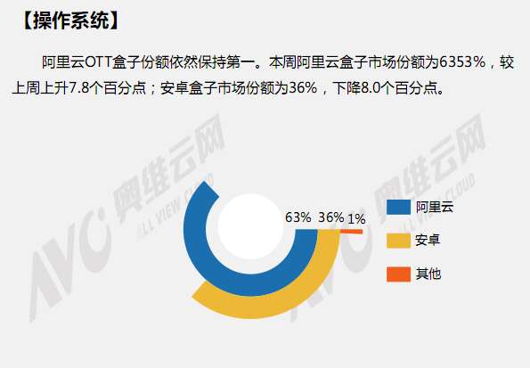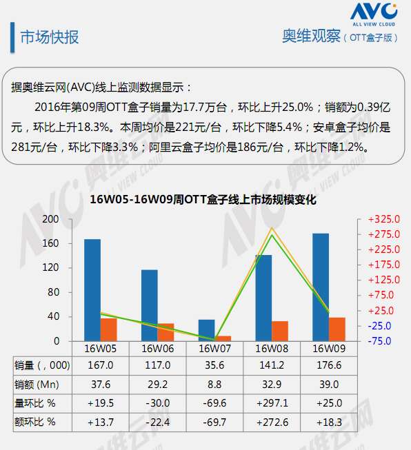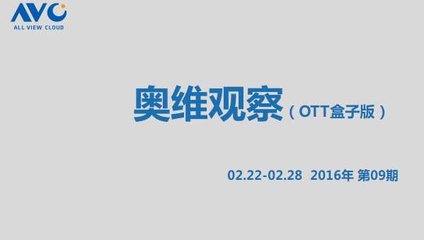 奥维云网:2016年2月22日-2月28日OTT盒子观察报告 奥维云网发布2月22日-2月28日OTT盒子观察报告,2016年第9周OTT盒子销量为17.7万台,环比上升25.0%;销售额为0.39亿元,环比上升18.3%。本周均价是221元/台,环比下降5.4%;安卓盒子均价是281元/台,环比下降3.3%;阿里云盒子均价是186元/台,环比上升1.2%。 更多阅读:奥维云网:2016上半年中国OTT盒子市场分析及预测奥维云网:2016年第一周OTT盒子销量为14.9万台奥维云网:2018年中国OTT发展预测报告奥维云网:2015年11月中国OTT指数报告奥维云网:2015年10月份中国OTT发展研究客厅迎来智能电视与OTT盒子竞争 奥维云网:2015年4月-9月线上智能电视盒大数据奥维云网 :2016年10月24日-10月30日OTT盒子观察报告2015年中国OTT盒子行业分析报告奥维云网:2017年中OTT运营大数据蓝皮书奥维云网:2018年OTT电商消费趋势报告奥维云网:2018年4月OTT大屏用户行为月报奥维云网:2017年度OTT全量数据排行榜奥维云网:2016年4月智能电视日均开机率为56%奥维云网:2017年2月20日-26日OTT盒子观察报告