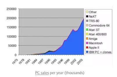 案例 1:Apple II 于 1977 年发布(Altair 发布于 1975 年),但实际上,是发布于 1981 年的 IBM 的 PC 机开始了 PC 产品周期的成长期。