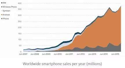 从此,智能机使用呈爆炸性增长:今天有大概 20 亿人拥有它,预计 2020 年全球有 80% 人口有智能手机。
