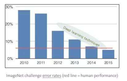 “深度学习”其实也是硅谷的一个流行语,但兴奋源自于瞩目的理论和现实世界结果的支持,比如对参加 ImageNet 挑战赛的获胜者来说,没使用“深度学习”前的错误率,可能达到 20-30%,而在使用情况下,获胜算法准确度会稳步提升,且在 2015 年超过了人的表现。