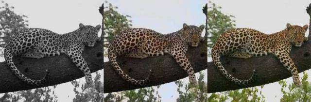 假设有个程序员在使用 TensorFLow 来给黑白照片着色。左边:黑白;中间:自动着色;右边:真实色彩。