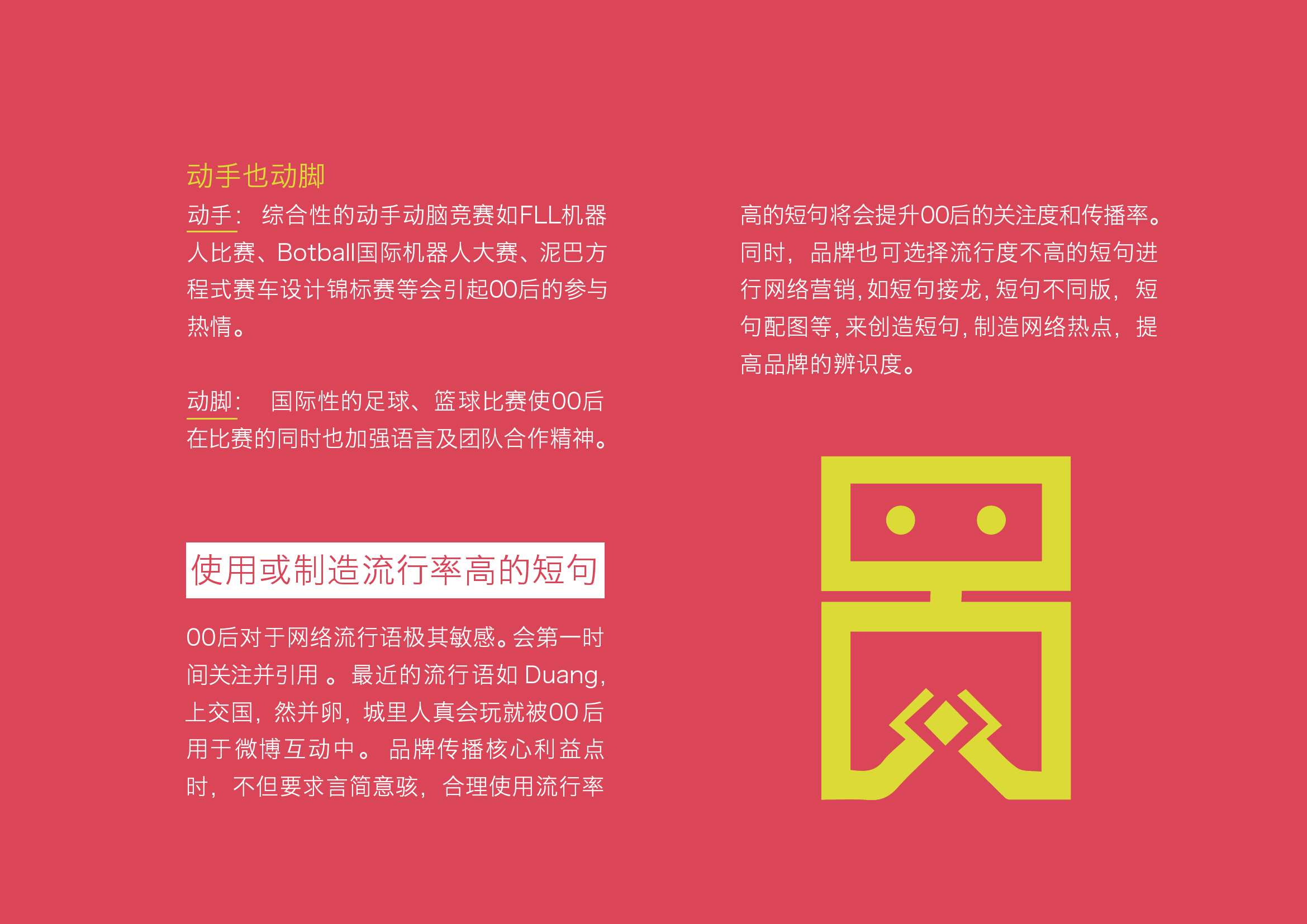 品牌启示:00后的生活相对单调。不是在书桌前,就是在手机上; 不是在上下学路上,就是在家补休。00后需要除学习之外的内容来调剂生活;00后需要从书本中抬起头来,即动脑也动手。品牌针对00后的活动不可越过学校,只能起到补缺的作用。