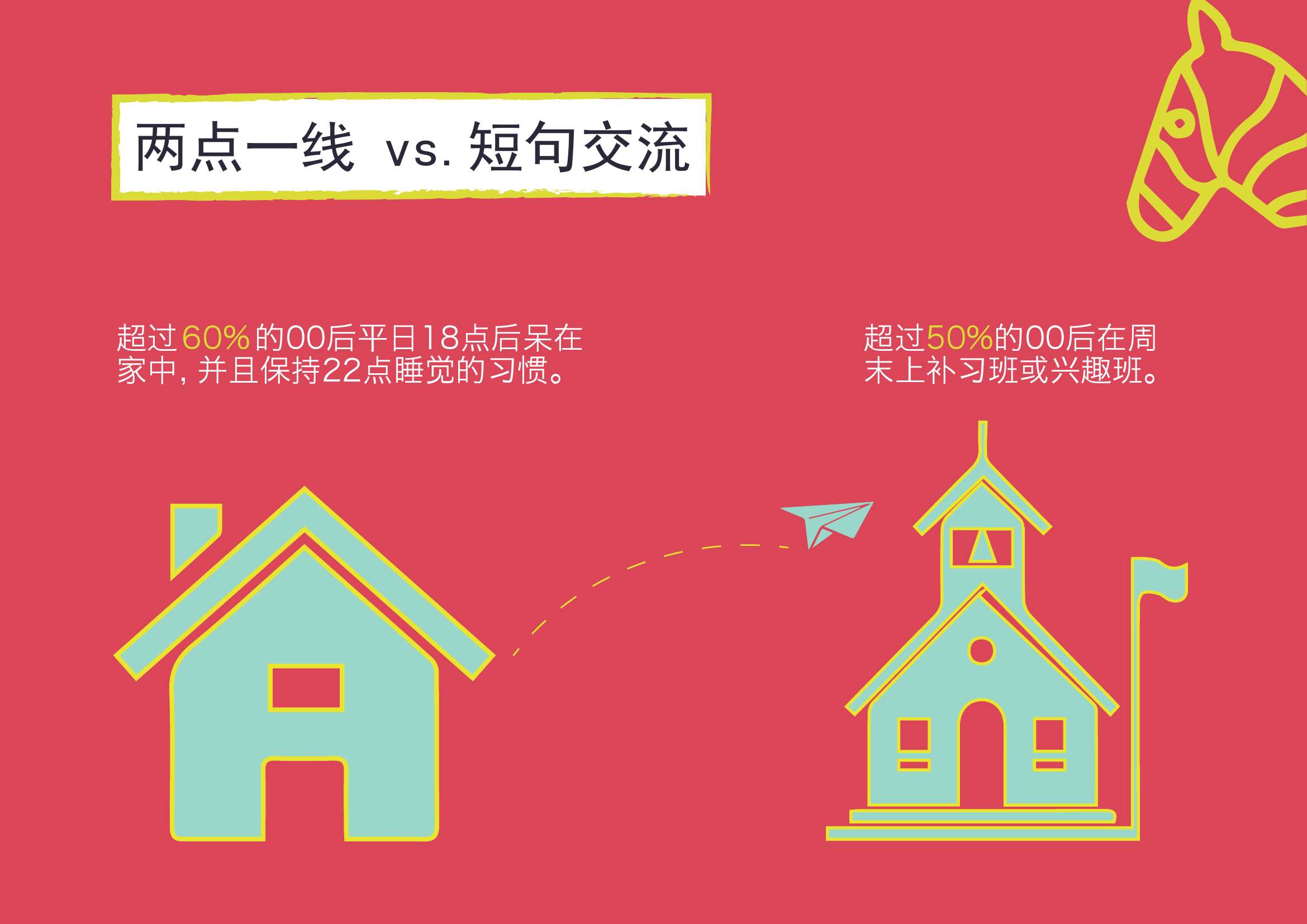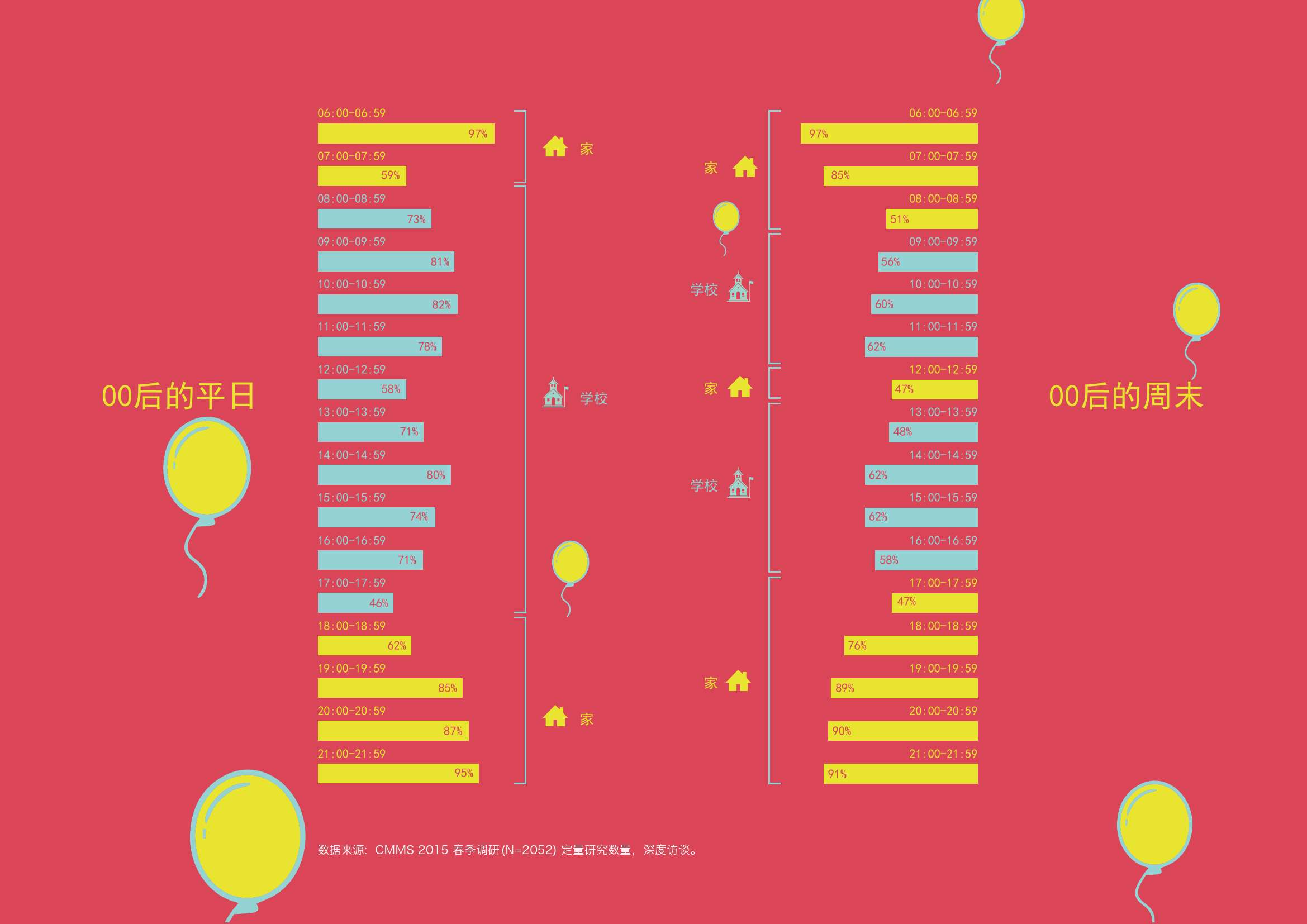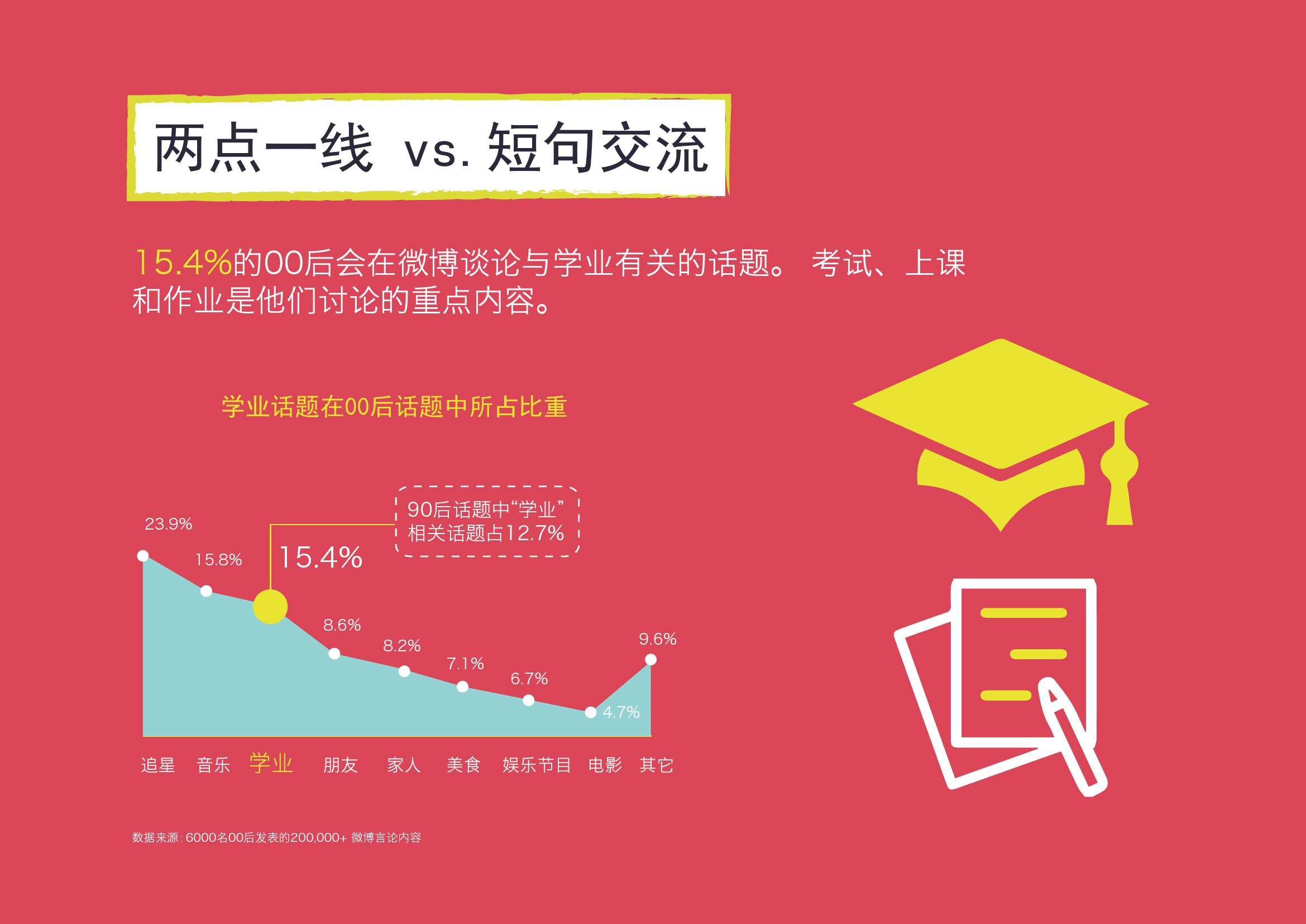 1. 家与学校是00后主要的活动场所。00后的学习目标以考上心仪的高中为主。超过50%的00后在周末会上补习班及兴趣班。在微博这类娱乐型平台上,15.4%的00后会谈论学业话题,高于90后。(90后为12.7%)