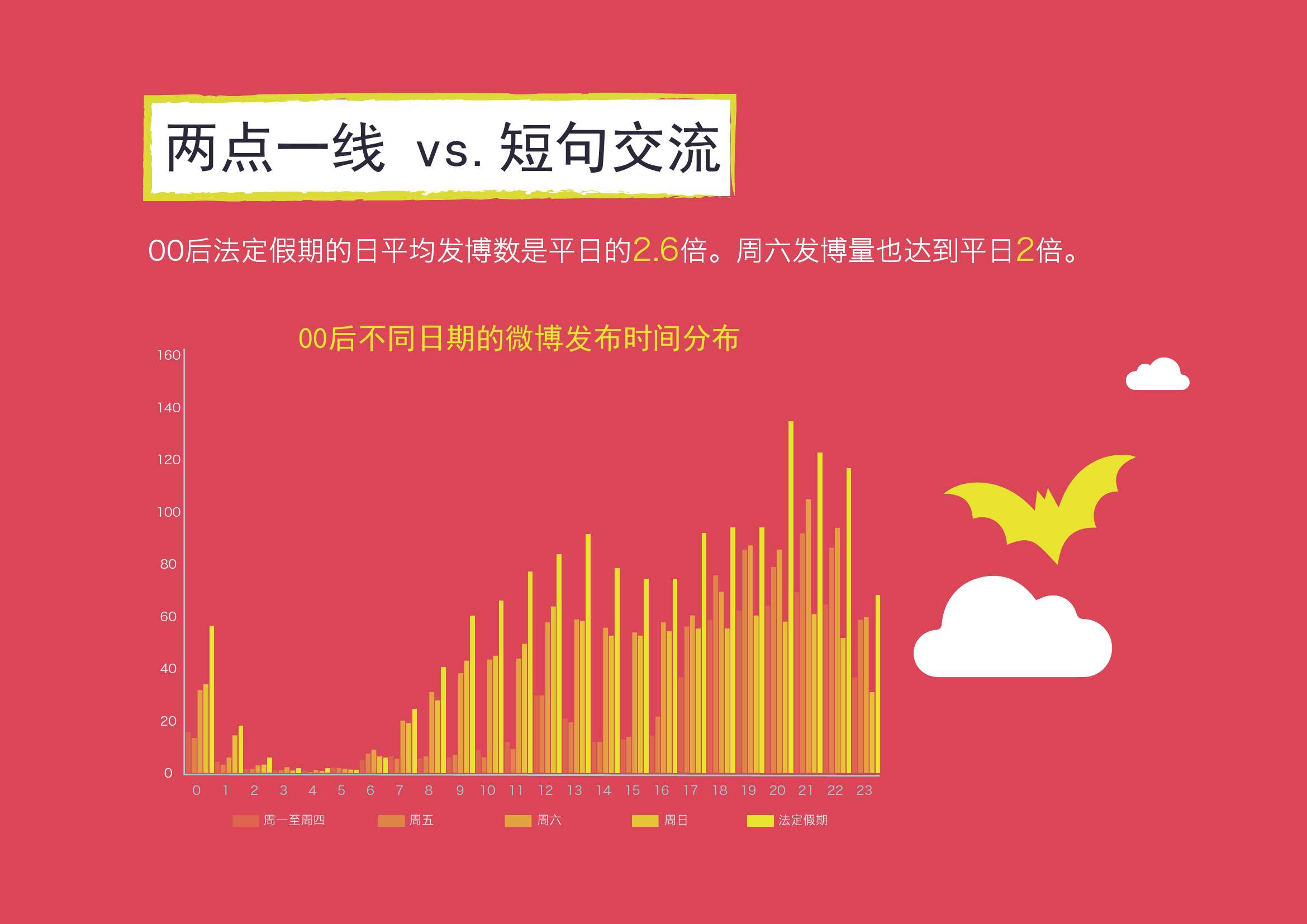 3. 学习及补习班/兴趣班占据了00后的大部分休闲时间。法定假期及周六是00后发博的高峰时段。而周一到周四发博量明显减少且集中在中午及晚间。法定假期的发博量是平日的2.6倍。