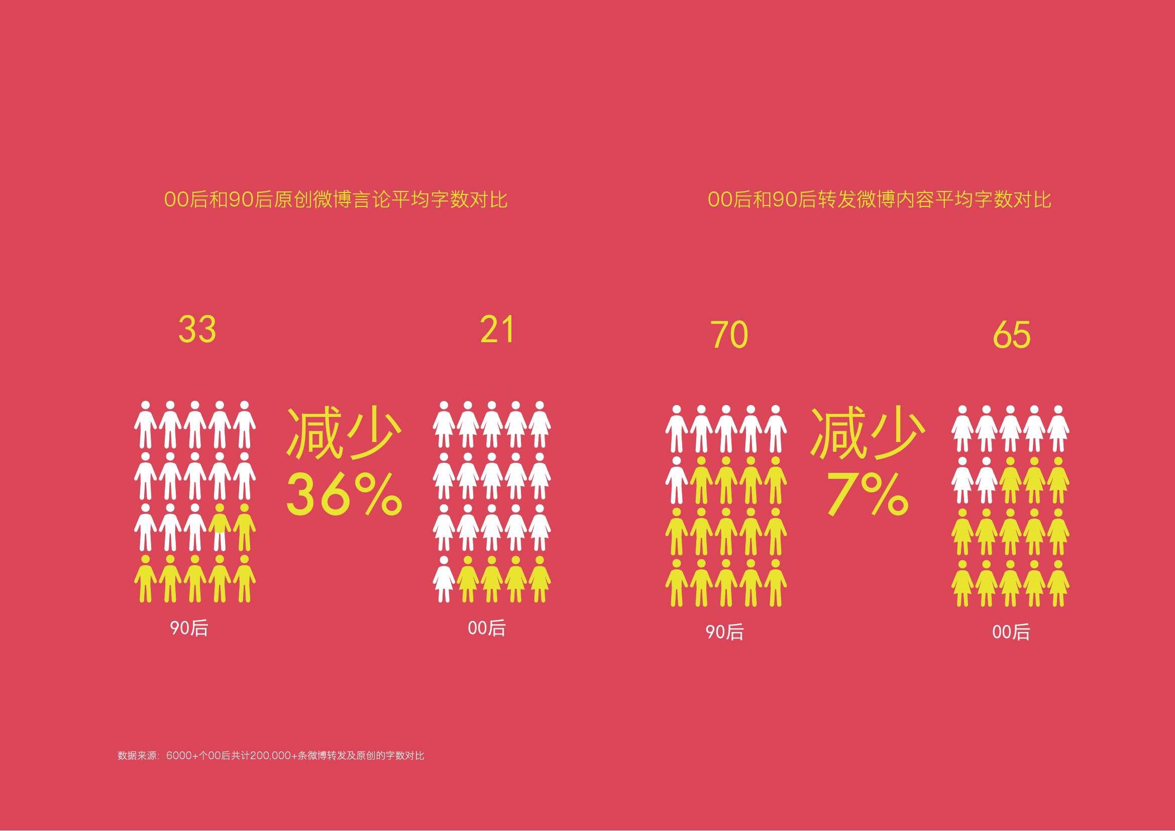 4. 受时间碎片化的影响,00后的资讯接收更偏向短小精悍。00后原创发博字数与90后相比减少36% ; 转发发博字数减少7%。
