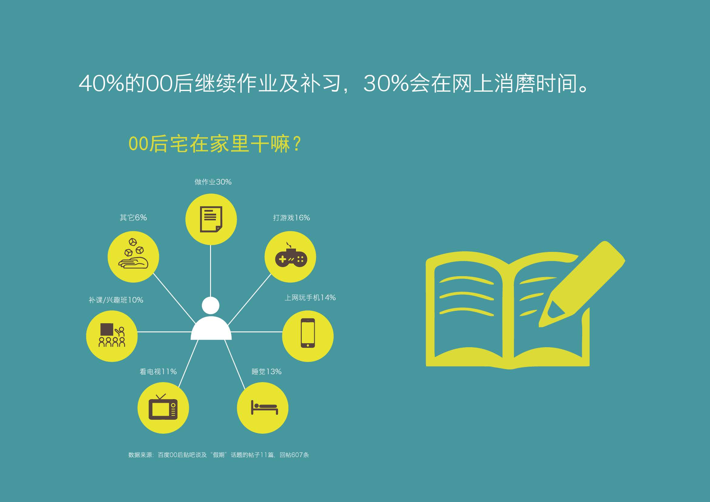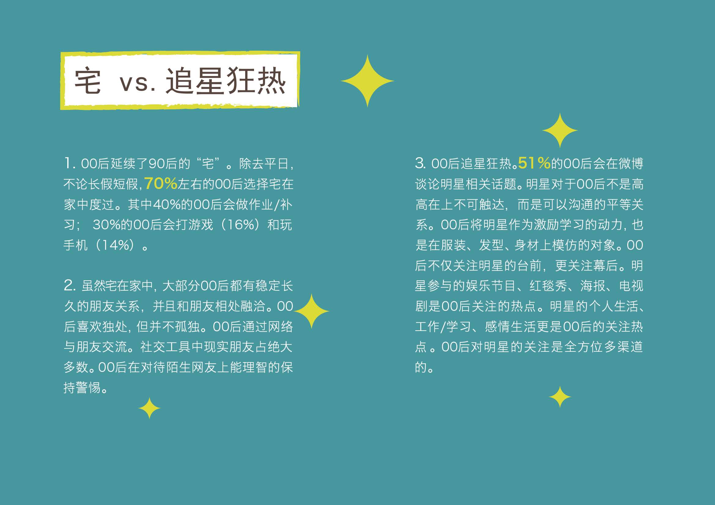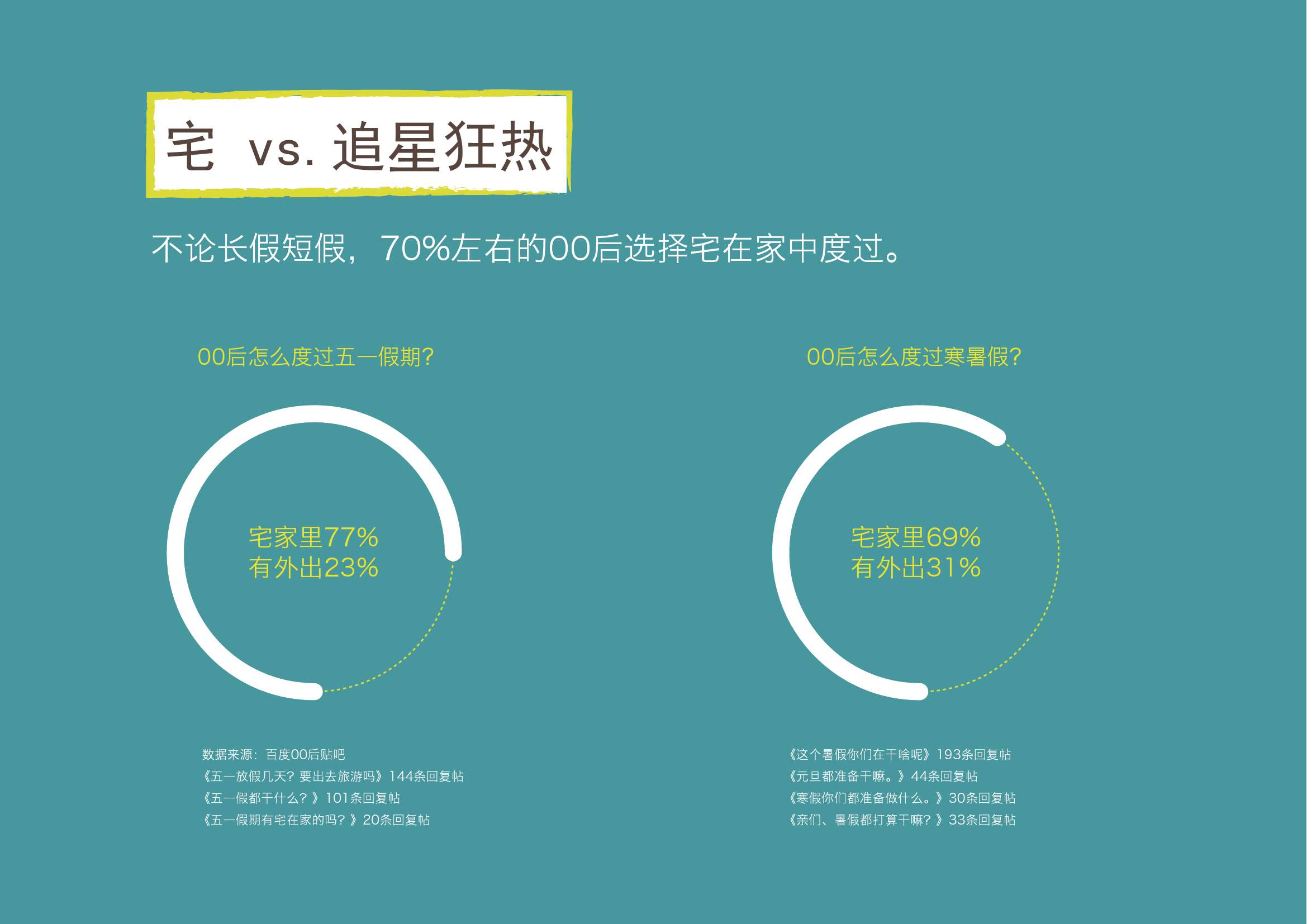 1. 00后延续了90后的“宅”。除去平日,不论长假短假,70%左右的00后选择宅在家中度过。其中40%的00后会做作业/补习; 30%的00后会打游戏(16%)和玩手机(14%)。