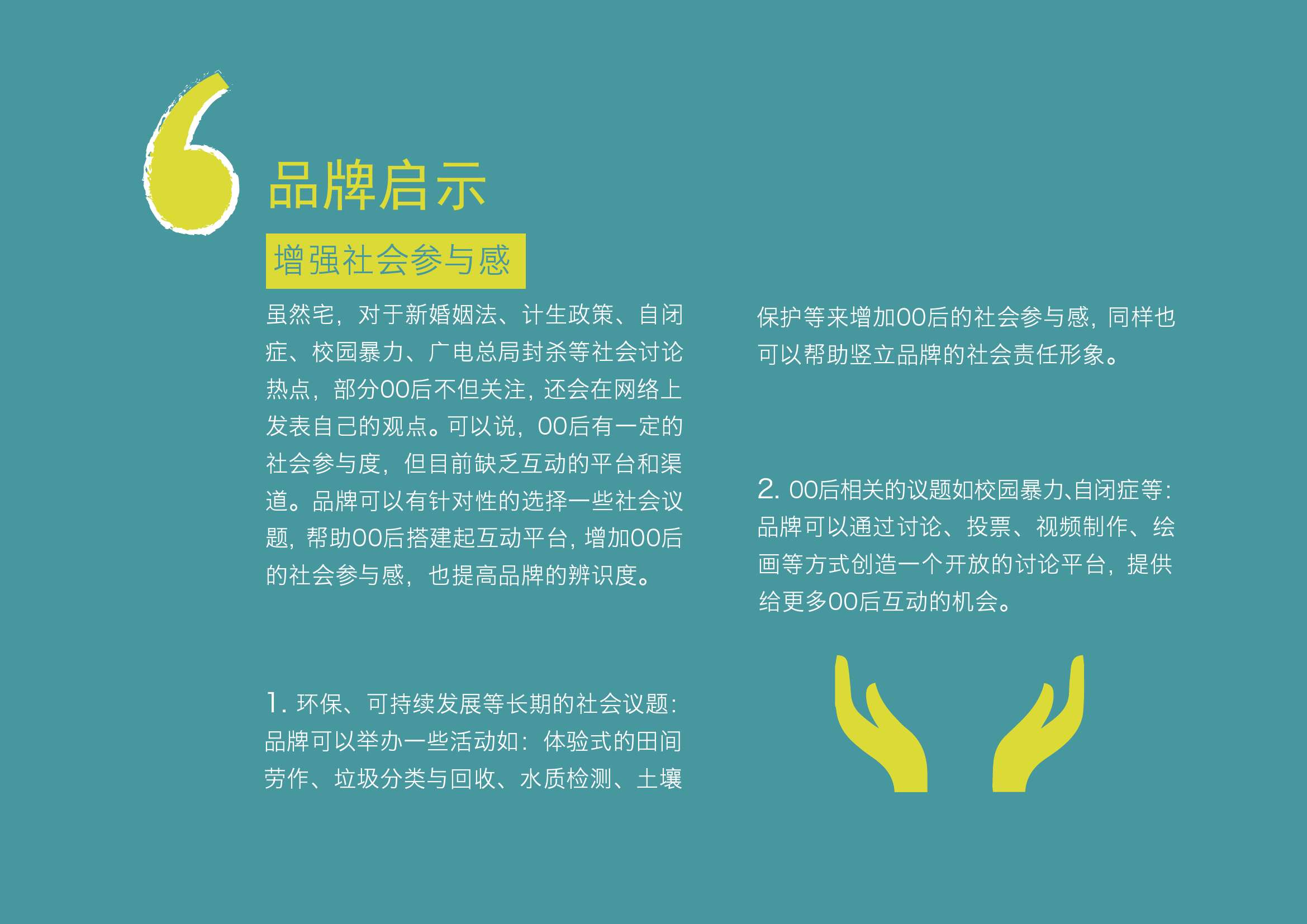 品牌启示:虽然宅,对于新婚姻法、计生政策、自闭症、校园暴力、广电总局封杀等社会讨论热点,部分00后不但关注,还会在网络上发表自己的观点。可以说,00后有一定的社会参与度,但目前缺乏互动的平台和渠道。品牌可以有针对性的选择一些社会议题,帮助00后搭建起互动平台,增加00后的社会参与感,也提高品牌的辨识度。