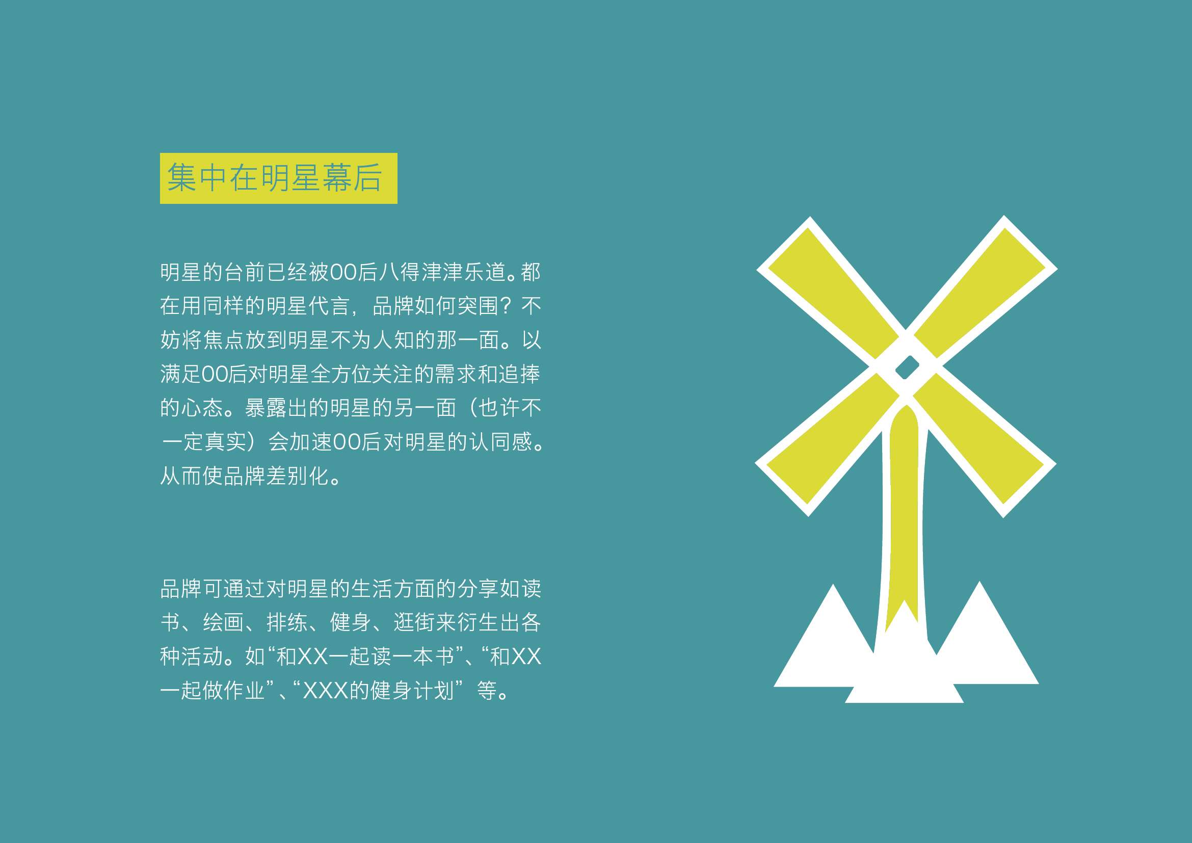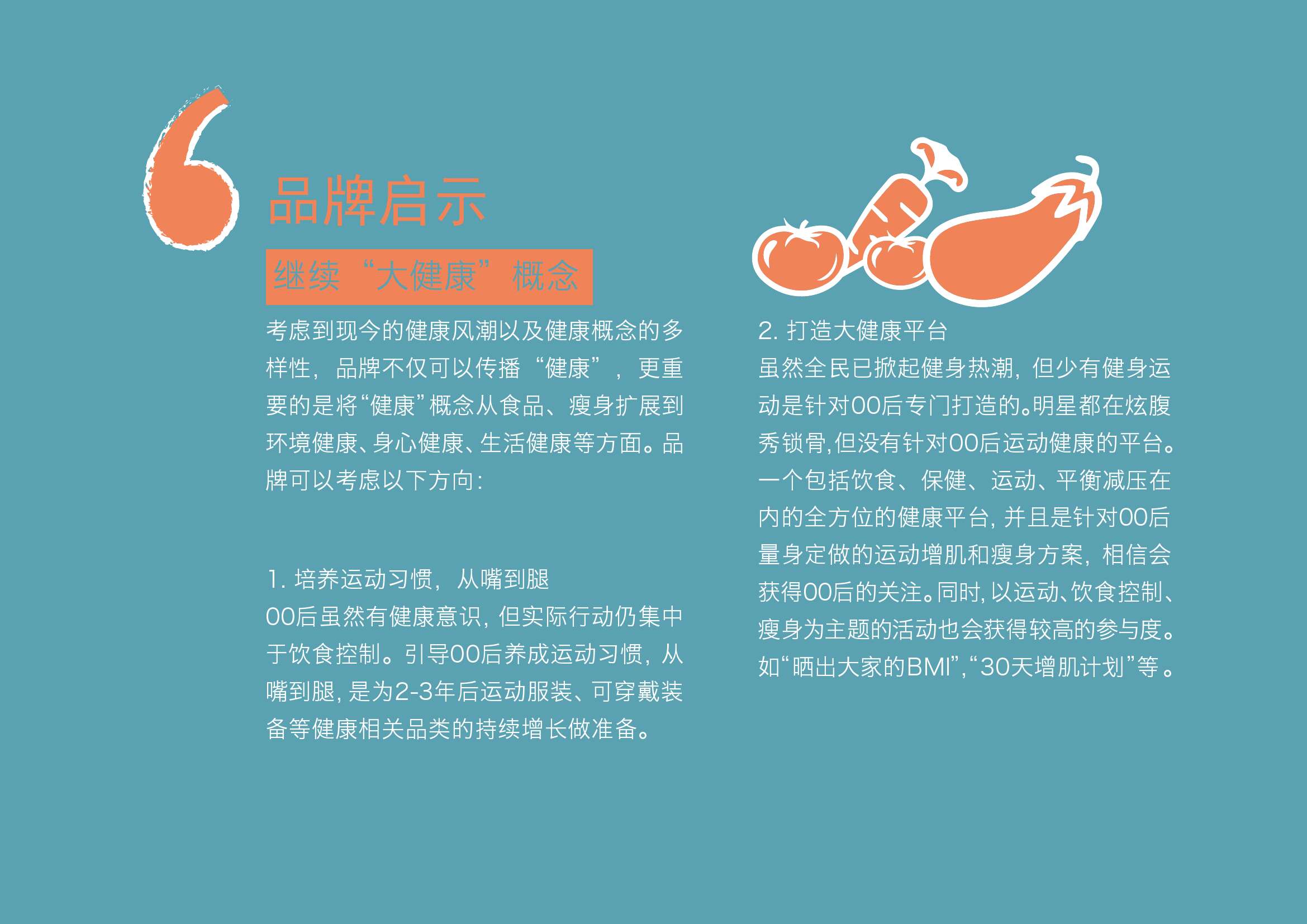 2. 打造大健康平台,虽然全民已掀起健身热潮,但少有健身运动是针对00后专门打造的。明星都在炫腹秀锁骨,但没有针对00后运动健康的平台。一个包括饮食、保健、运动、平衡减压在内的全方位的健康平台,并且是针对00后量身定做的运动增肌和瘦身方案,相信会获得00后的关注。 同时,以运动、饮食控制、瘦身为主题的活动也会获得较高的参与度。如“晒出大家的BMI”, “30天增肌计划”等 。
