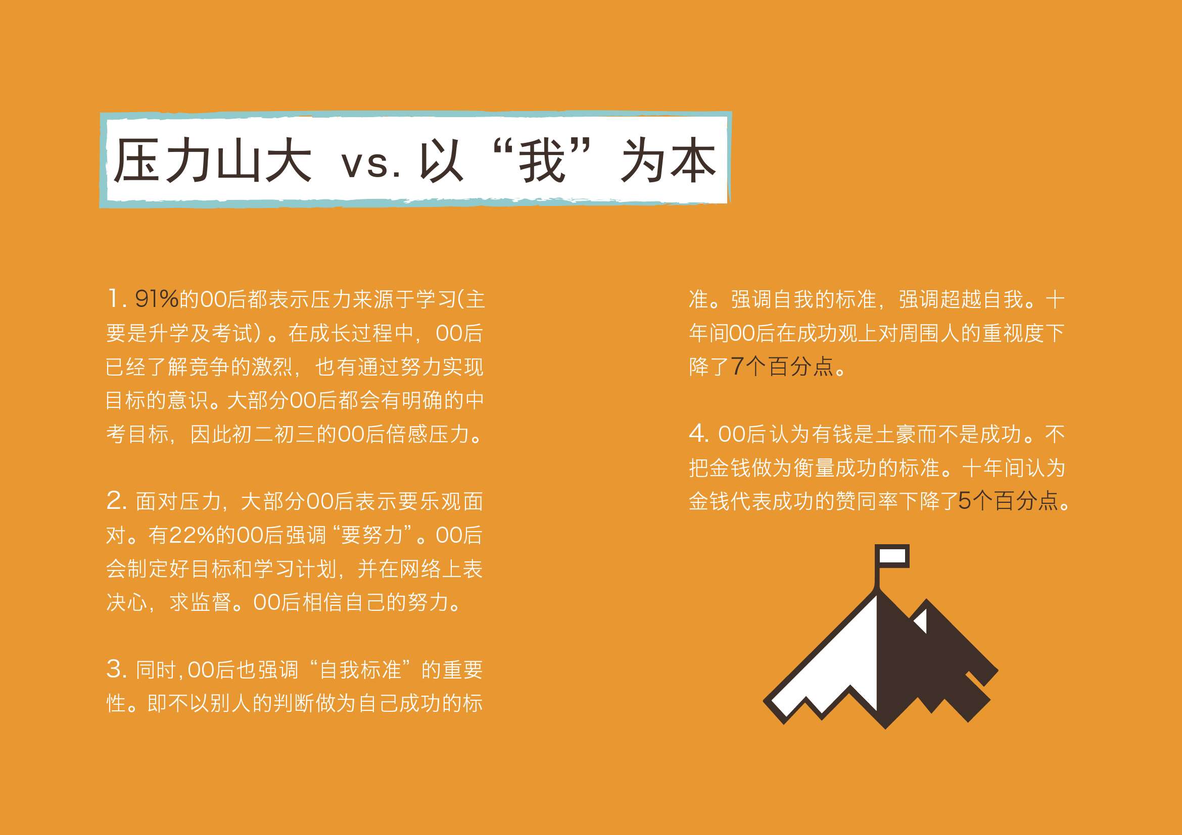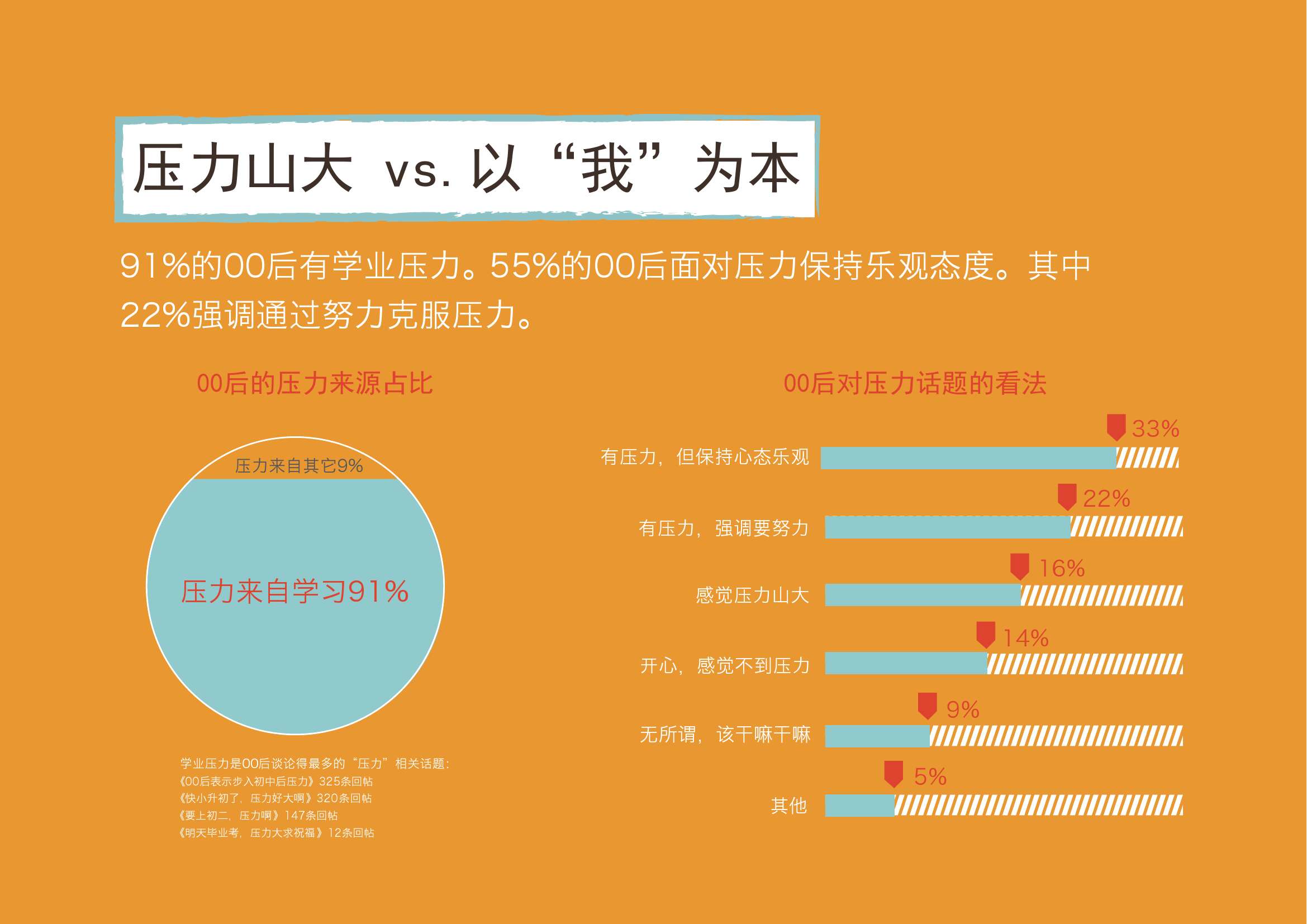 1. 91%的00后都表示压力来源于学习(主要是升学及考试)。在成长过程中,00后已经了解竞争的激烈,也有通过努力实现目标的意识。大部分00后都会有明确的中考目标,因此初二初三的00后倍感压力。