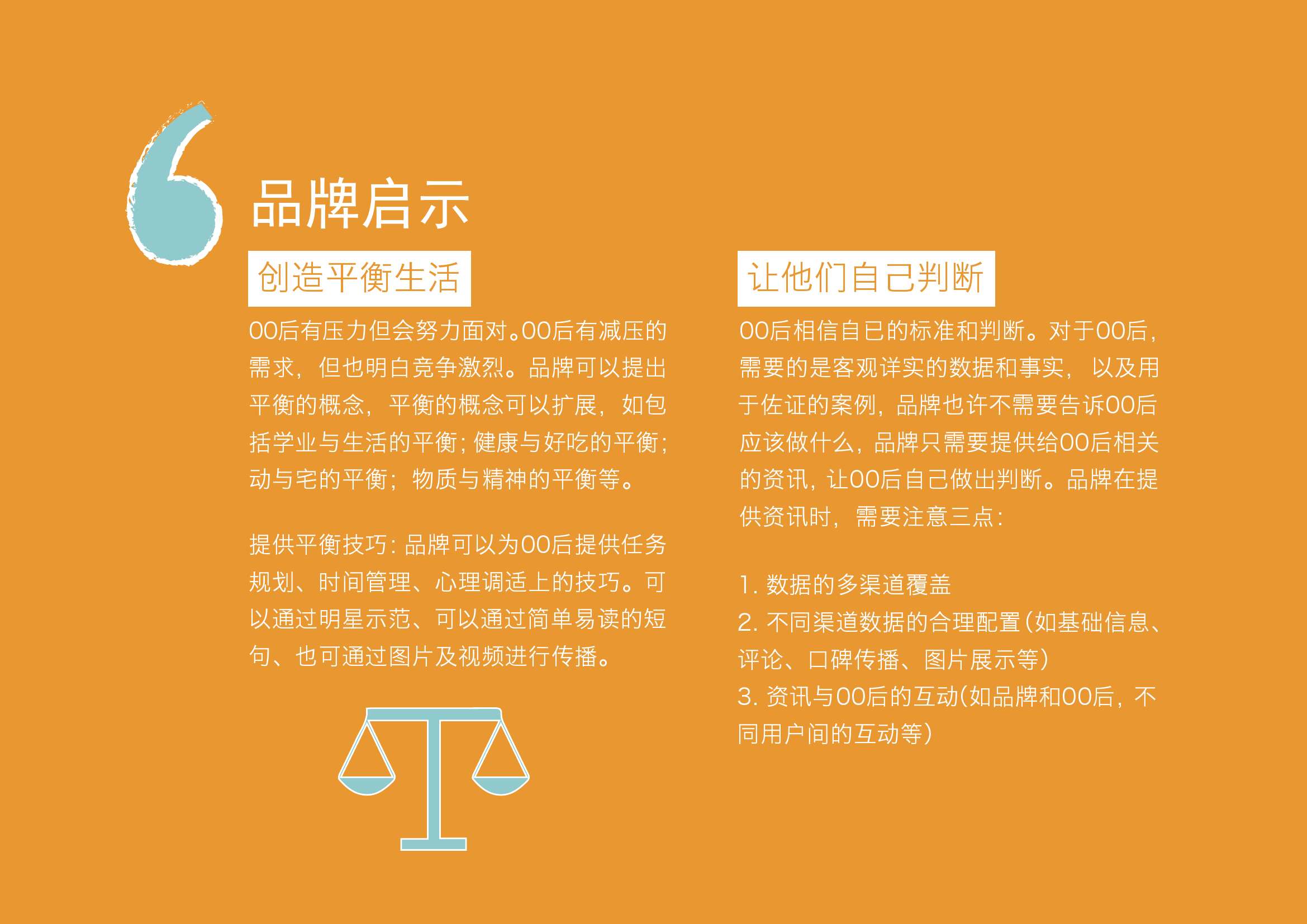 品牌启示:00后有压力但会努力面对。00后有减压的需求,但也明白竞争激烈。品牌可以提出平衡的概念,平衡的概念可以扩展,如包括学业与生活的平衡;健康与好吃的平衡;动与宅的平衡;物质与精神的平衡等。提供平衡技巧:品牌可以为00后提供任务规划、时间管理、心理调适上的技巧。可以通过明星示范、可以通过简单易读的短句、也可通过图片及视频进行传播。