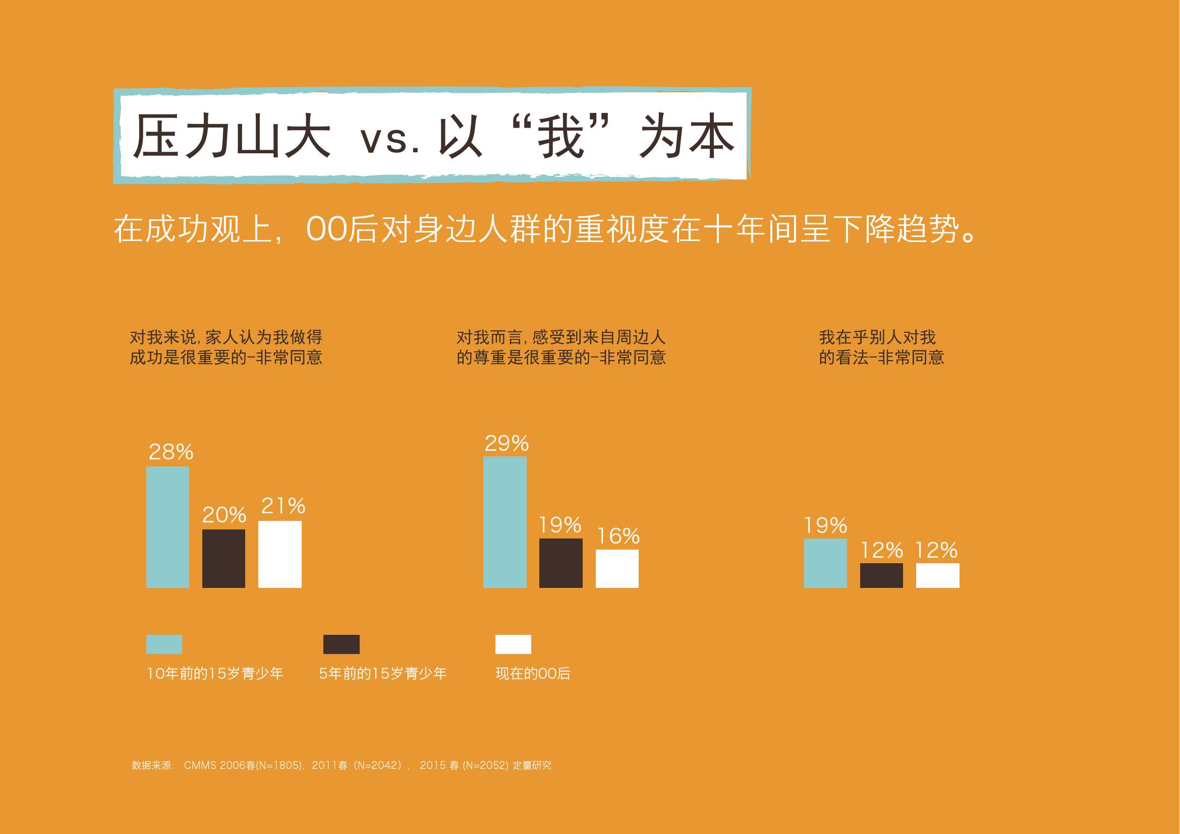 3. 同时,00后也强调“自我标准”的重要性。即不以别人的判断做为自己成功的标准。强调自我的标准,强调超越自我。十年间00后在成功观上对周围人的重视度下降了7个百分点。