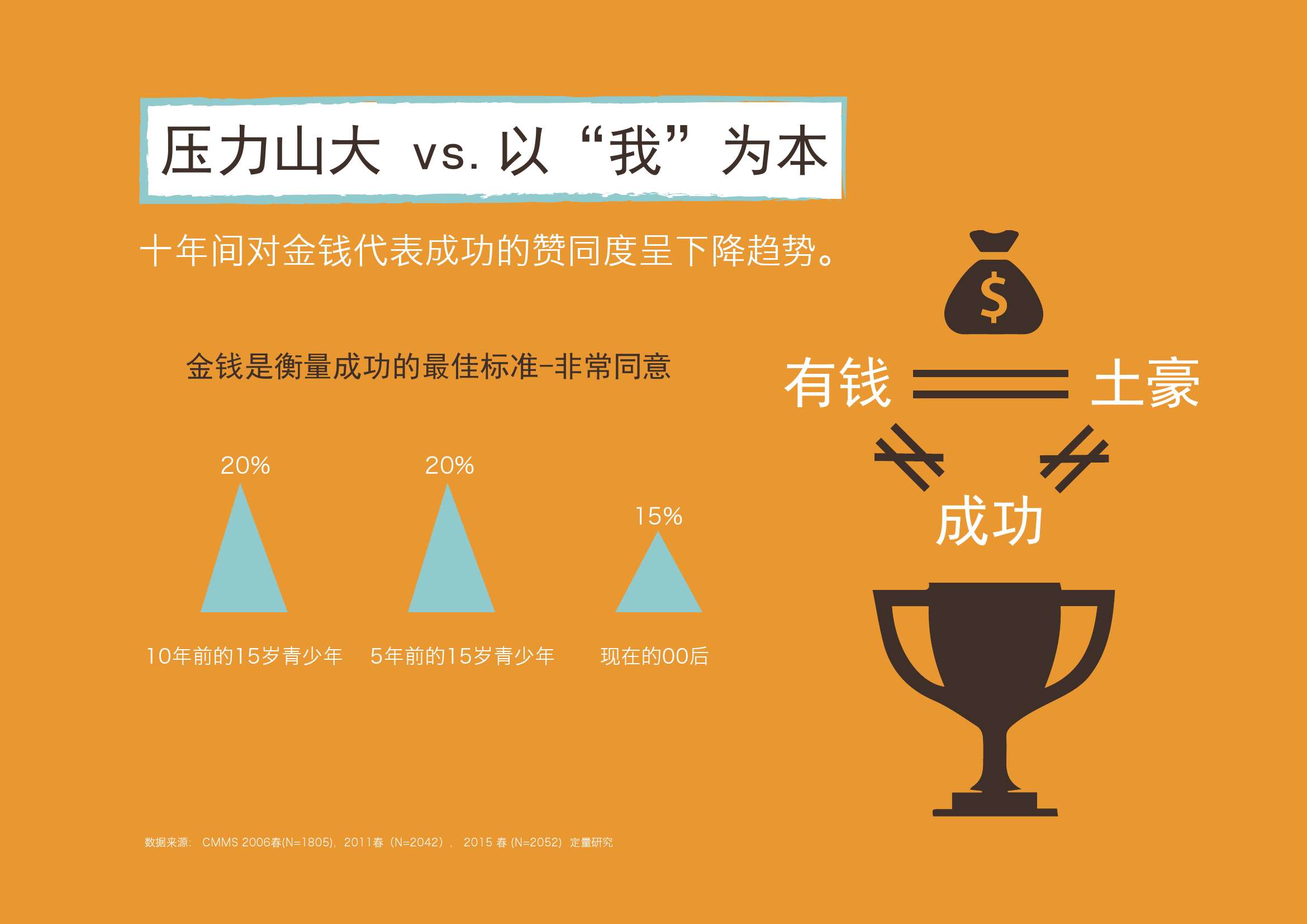 4. 00后认为有钱是土豪而不是成功。不把金钱做为衡量成功的标准。十年间认为金钱代表成功的赞同率下降了5个百分点。
