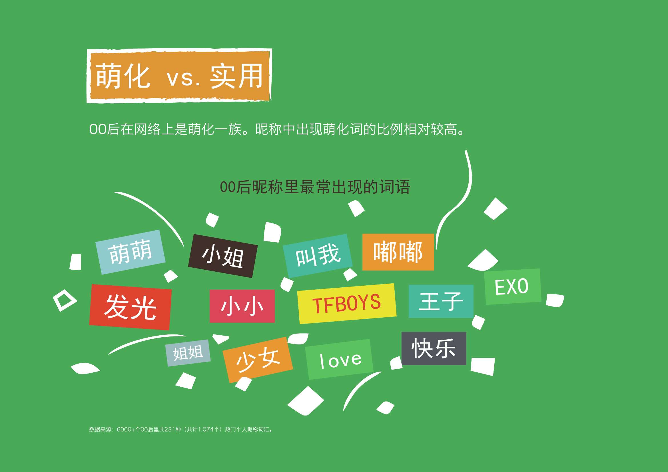 1. 00后在网络上是萌化一族。部分00后的微博昵称直接叫“XX萌萌”、“小小XX”或是”XX嘟嘟”。其它偏萌性的词如“XX小姐”、“ XX王子”、“XX会发光”的出现率也较高。