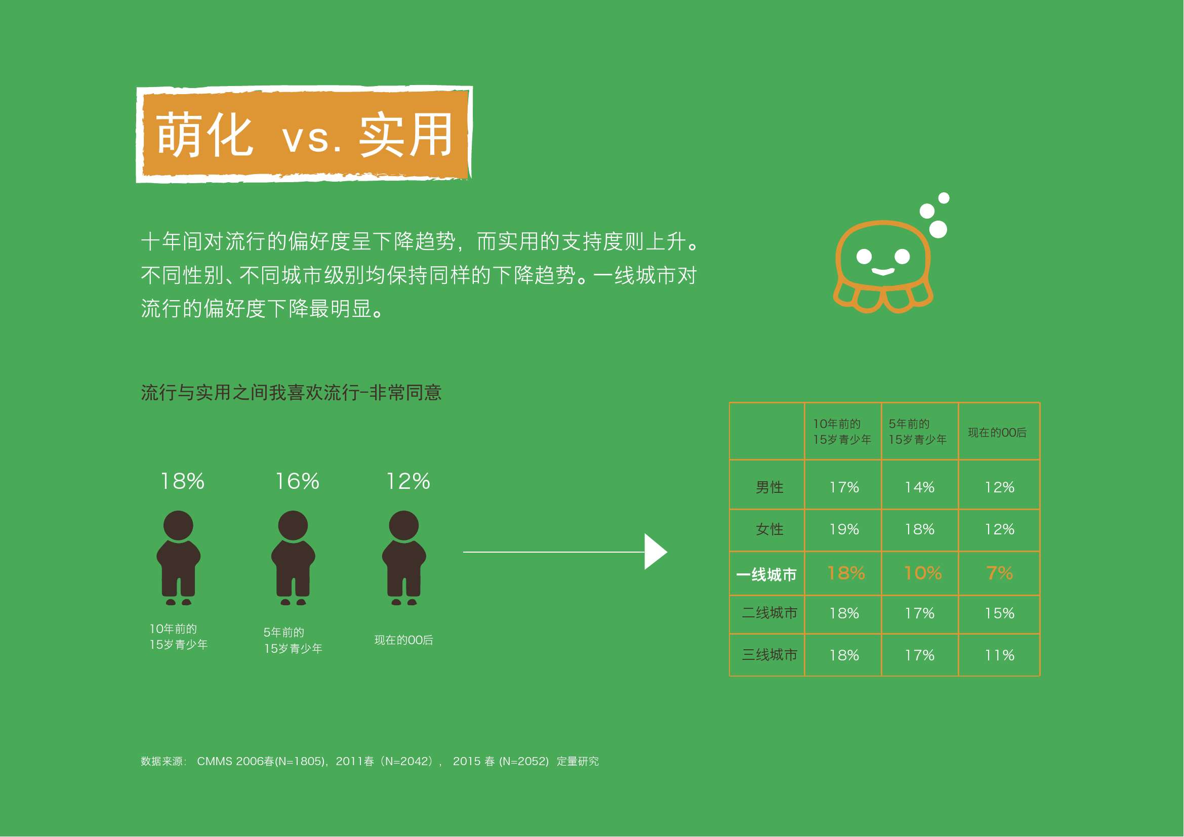 3. 虽然00后在网络上是“ 萌化一族”,相比流行与实用,十年间00后对流行的支持度呈下降趋势。 尤其一线城市的下降趋势更明显。
