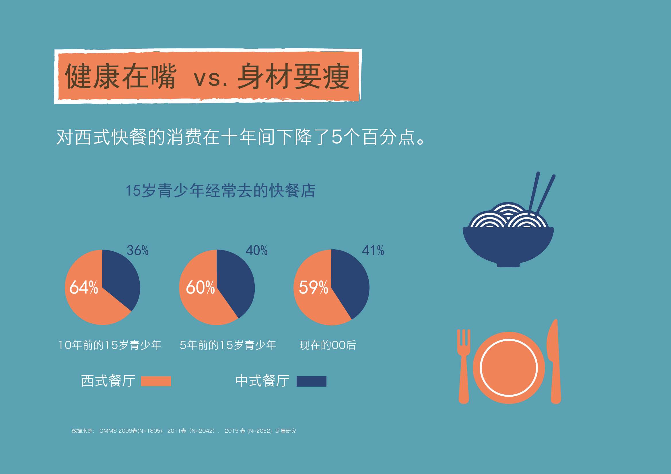 1. 在追求健康的整体大环境影响下,00后也表现出对健康的追求。但00后的健康主要集中在“嘴”上。十年间,对西式快餐的消费下降5个百分点。