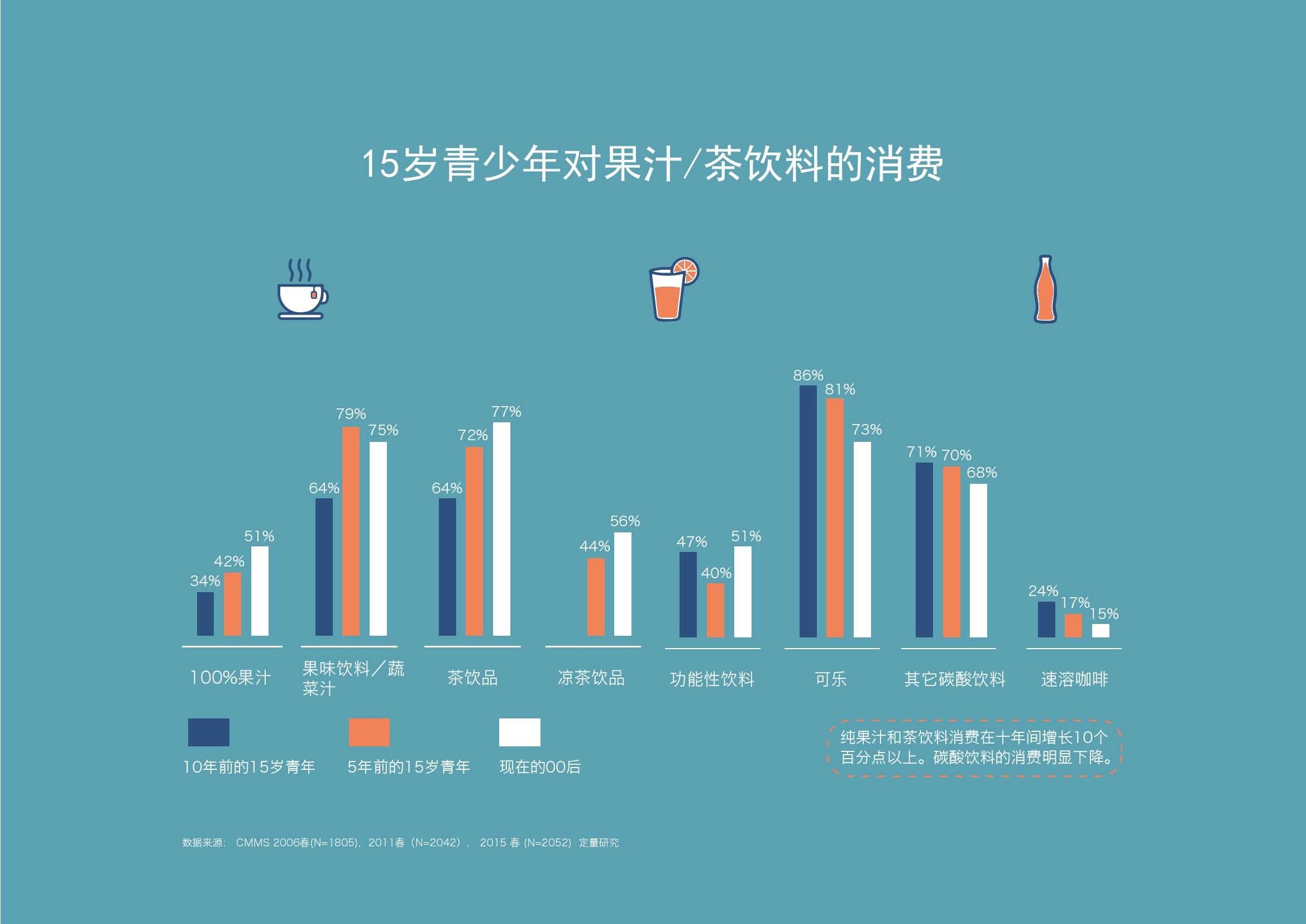 2. 在饮料消费方面,十年间对健康饮料的消费呈明显的上升趋势。100%纯果汁上升17个百分点;茶饮料上升13个百分点;果蔬饮料上升11个百分点。而可乐则下降13个百分比;速溶咖啡下降9个百分点。