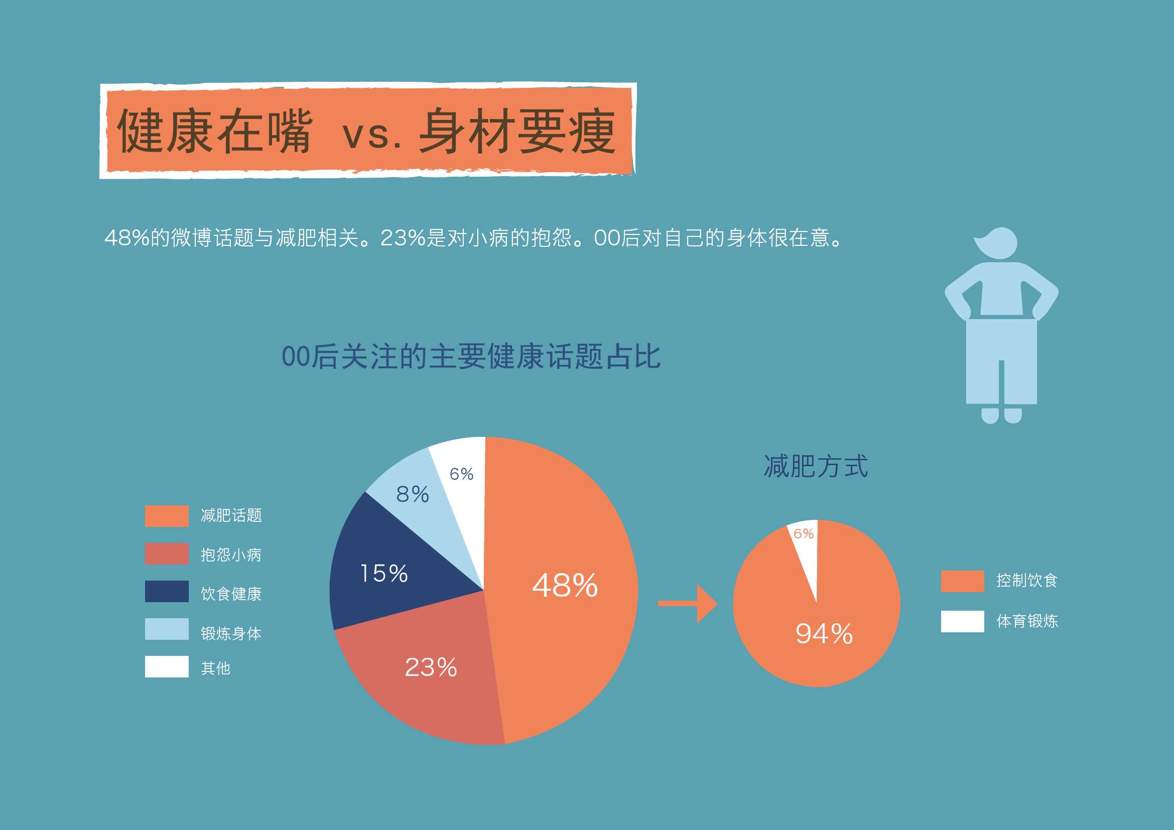 3. 除了健康,受以瘦为美的影响,00后还格外关注身材。48%的00后会在微博上讨论减肥的话题(锻炼身体为8%)。而其中94%的00后表示会用控制饮食的方式来减肥。仅有6%会提及体育锻炼。