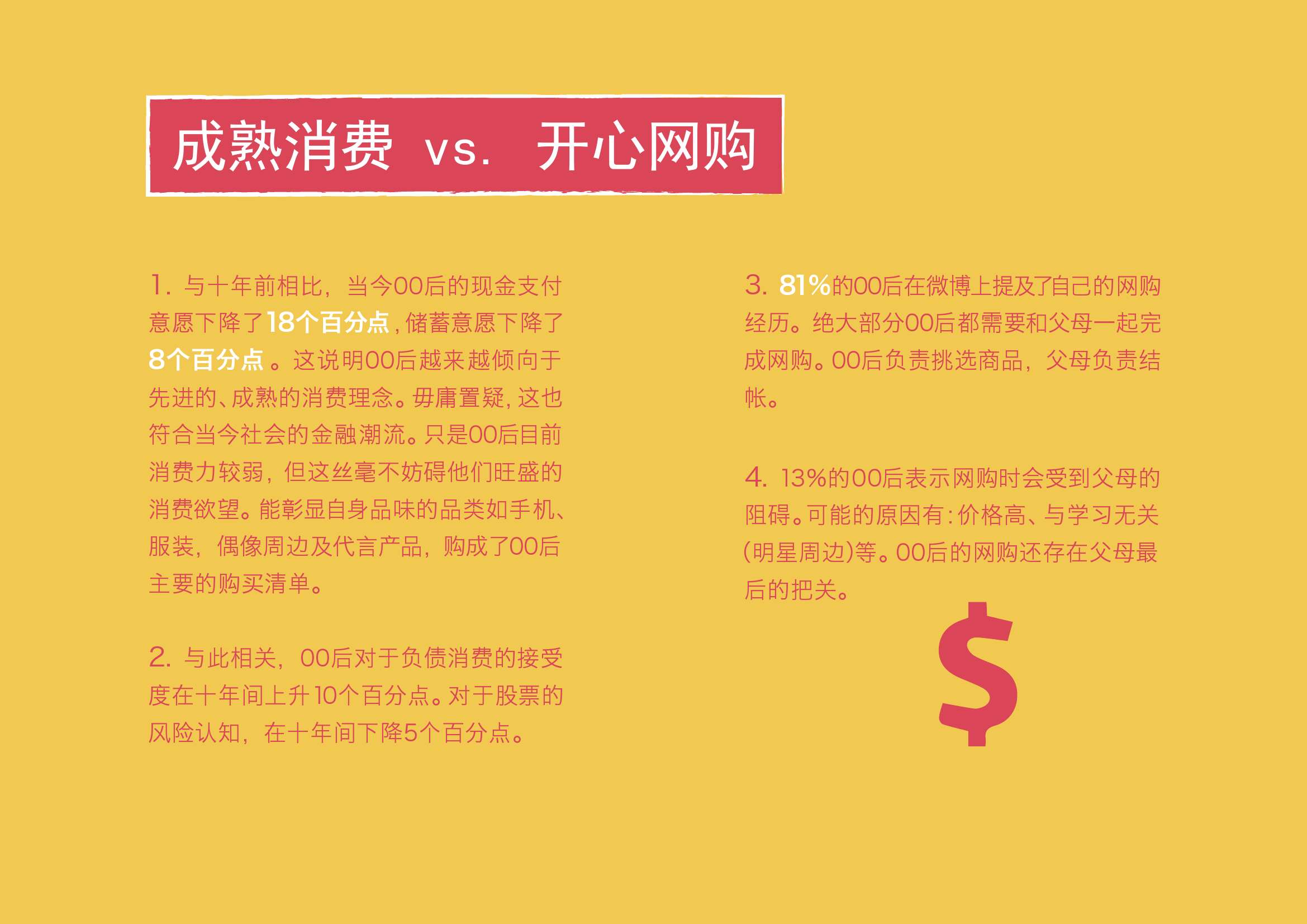 1. 与十年前相比,当今00后的现金支付意愿下降了18个百分点,储蓄意愿下降了8个百分点。这说明00后越来越倾向于先进的、成熟的消费理念。毋庸置疑,这也符合当今社会的金融潮流。只是00后目前消费力较弱,但这丝毫不妨碍他们旺盛的消费欲望。能彰显自身品味的品类如手机、服装,偶像周边及代言产品,购成了00后主要的购买清单。