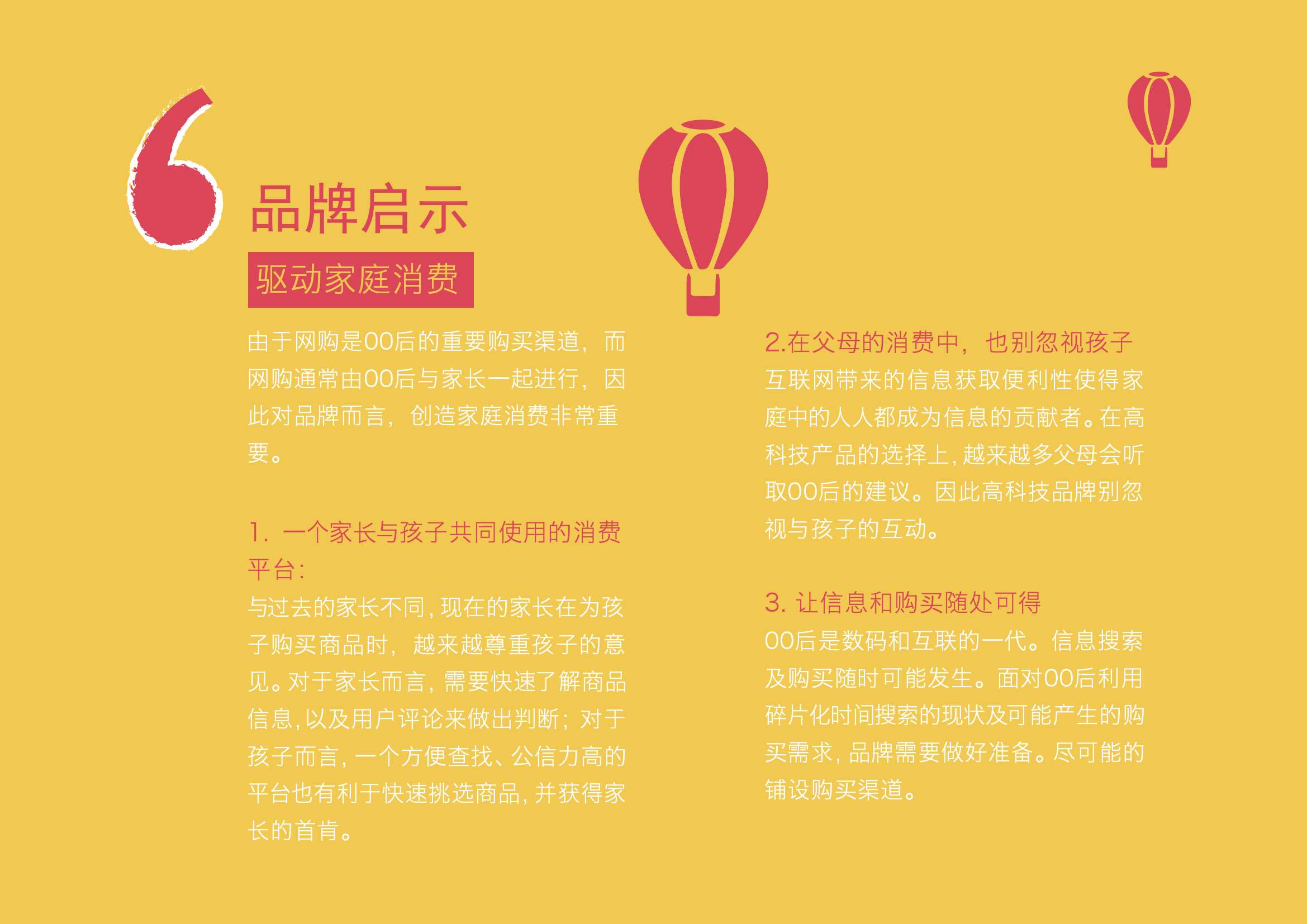 2.在父母的消费中,也别忽视孩子。互联网带来的信息获取便利性使得家庭中的人人都成为信息的贡献者。在高科技产品的选择上,越来越多父母会听取00后的建议。因此高科技品牌别忽视与孩子的互动。