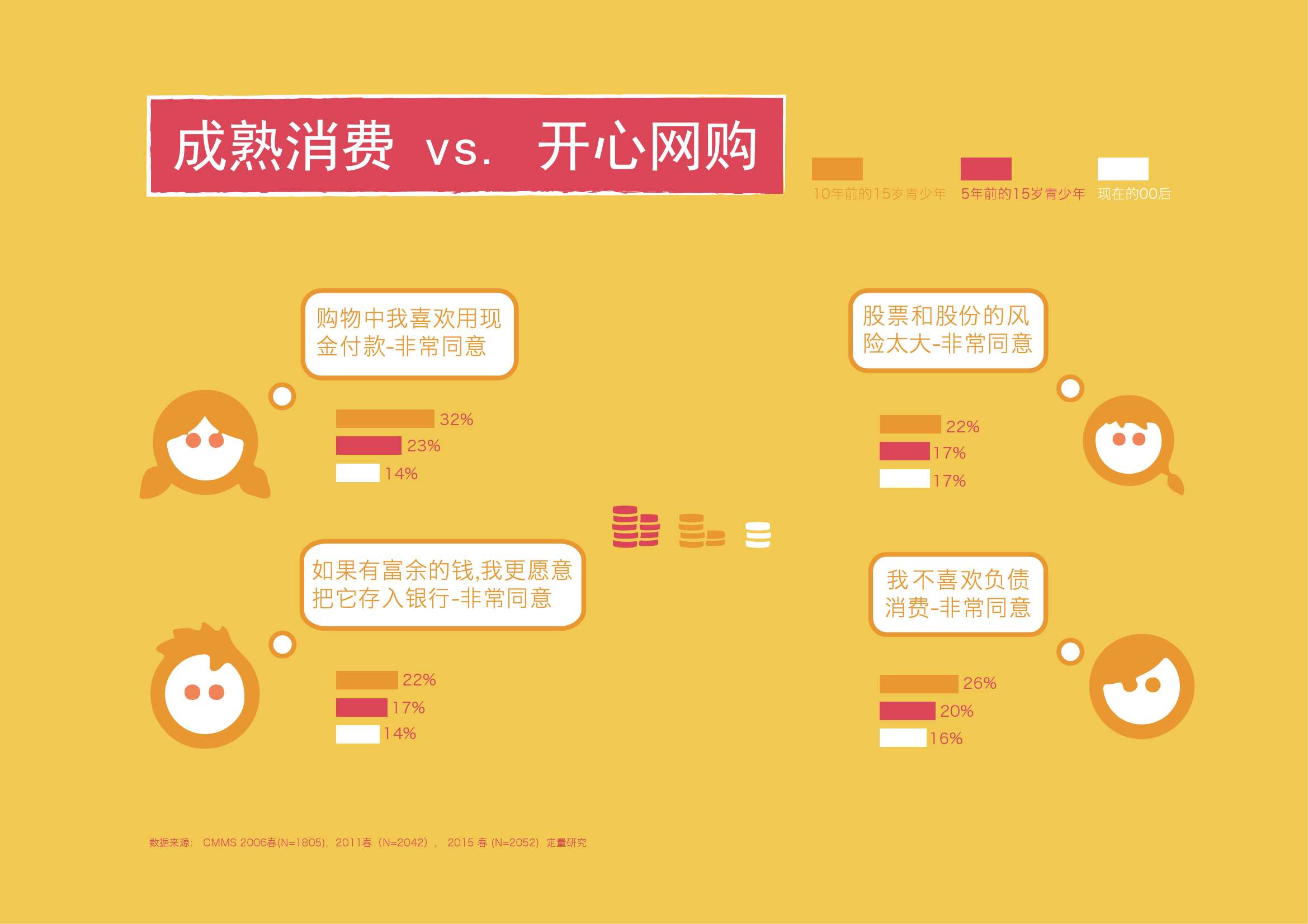 2. 与此相关,00后对于负债消费的接受度在十年间上升10个百分点。对于股票的风险认知,在十年间下降5个百分点。