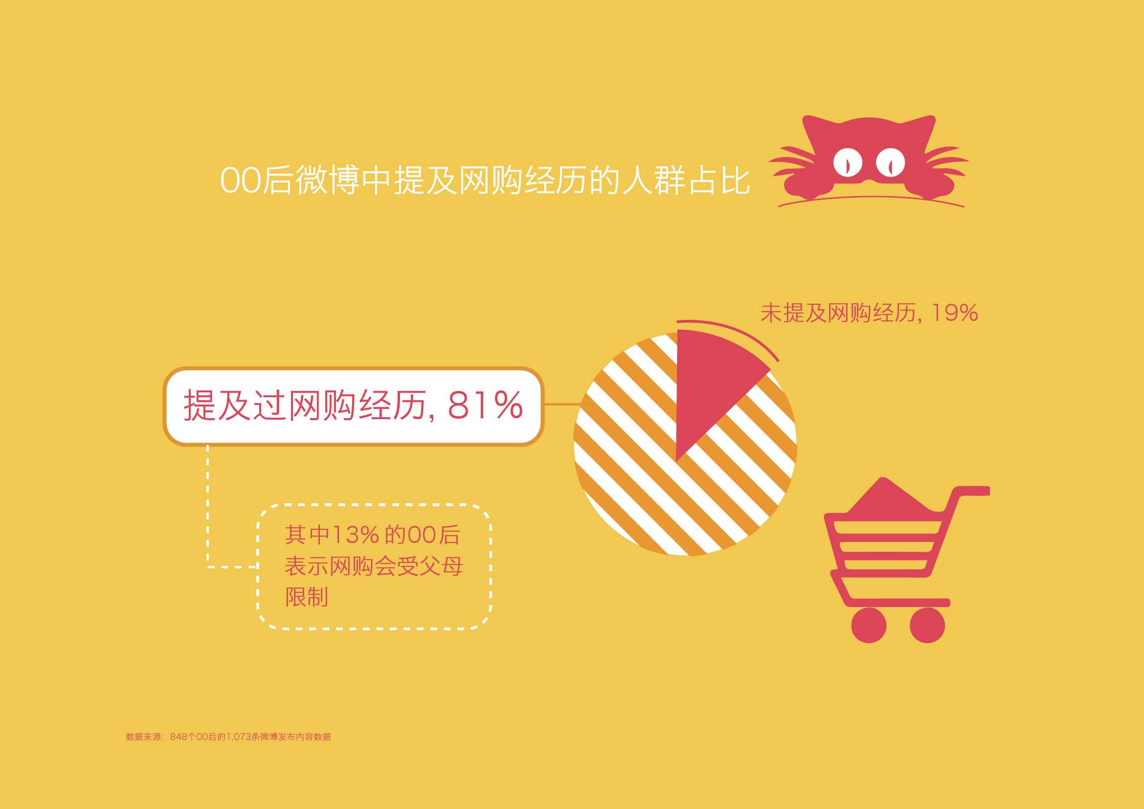 3. 81%的00后在微博上提及了自己的网购经历。绝大部分00后都需要和父母一起完成网购。00后负责挑选商品,父母负责结帐。