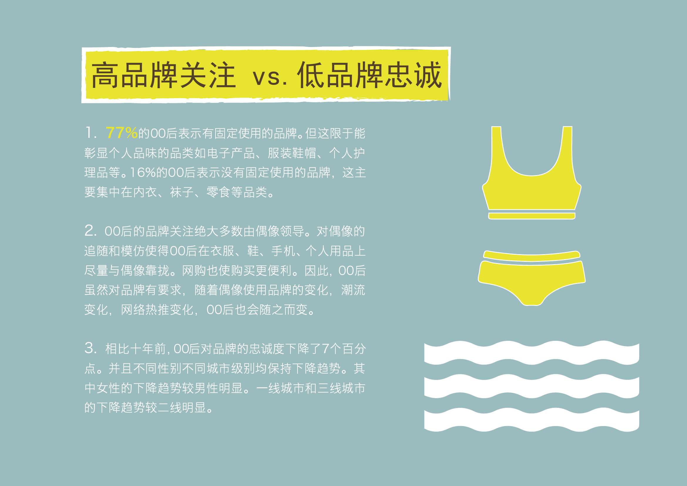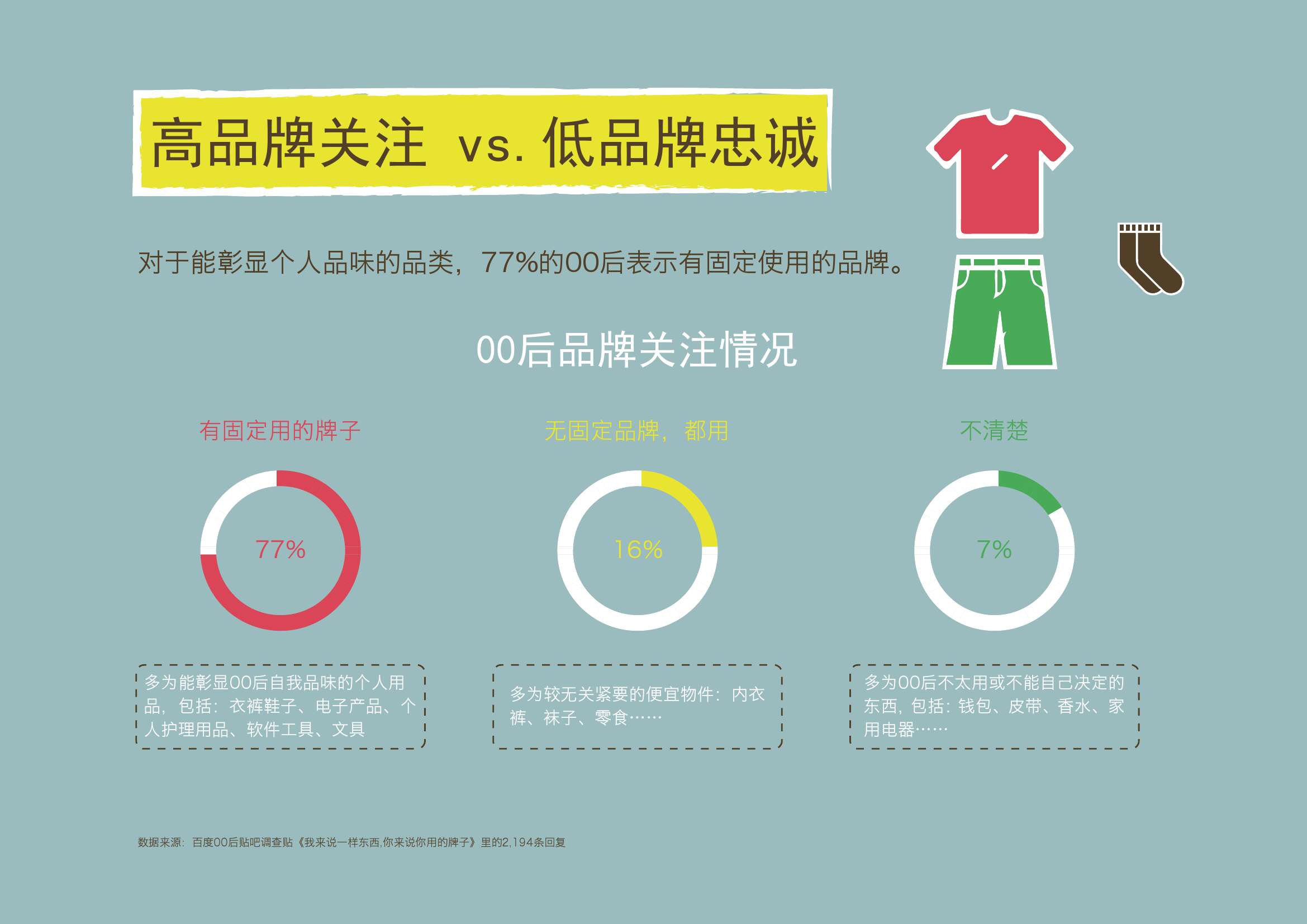 1. 77%的00后表示有固定使用的品牌。但这限于能彰显个人品味的品类如电子产品、服装鞋帽、个人护理品等。16%的00后表示没有固定使用的品牌,这主要集中在内衣、袜子、食等品类。