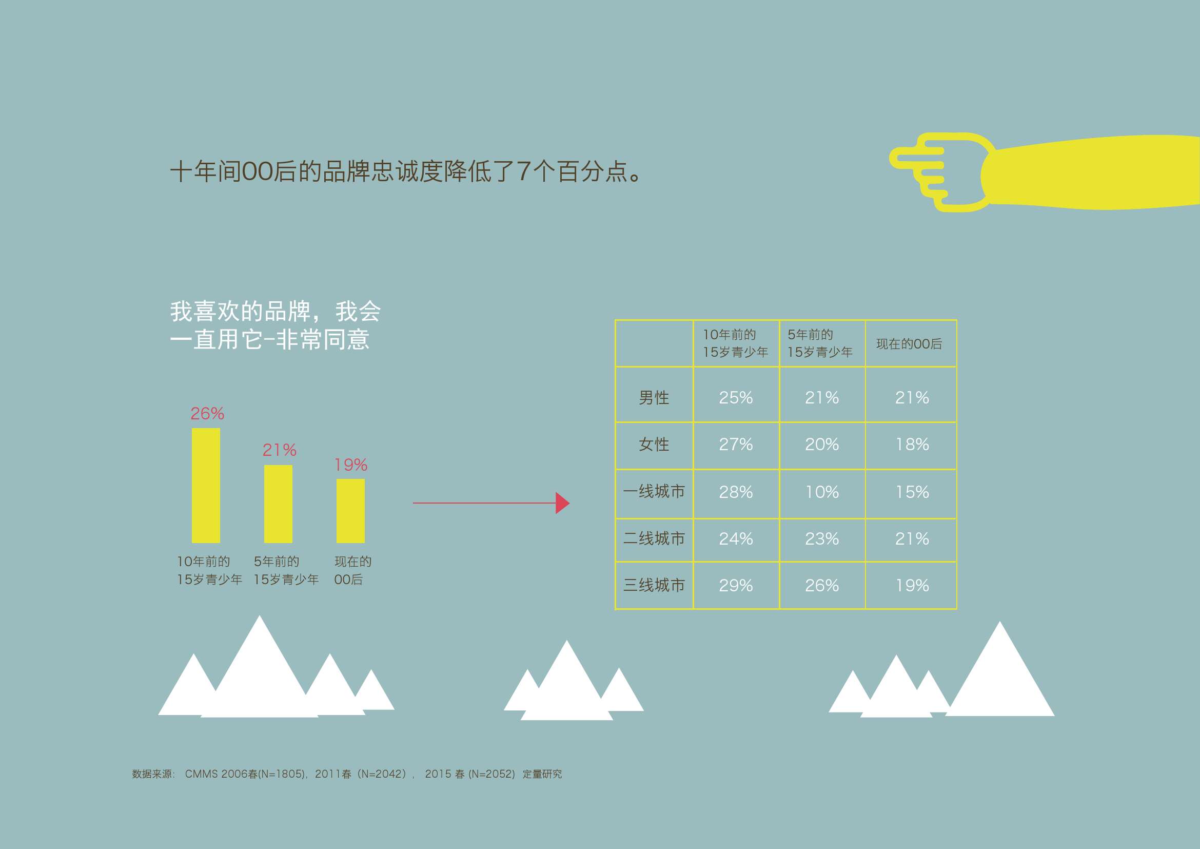 3. 相比十年前,00后对品牌的忠诚度下降了7个百分点。并且不同性别不同城市级别均保持下降趋势。其中女性的下降趋势较男性明显。一线城市和三线城市的下降趋势较二线明显。