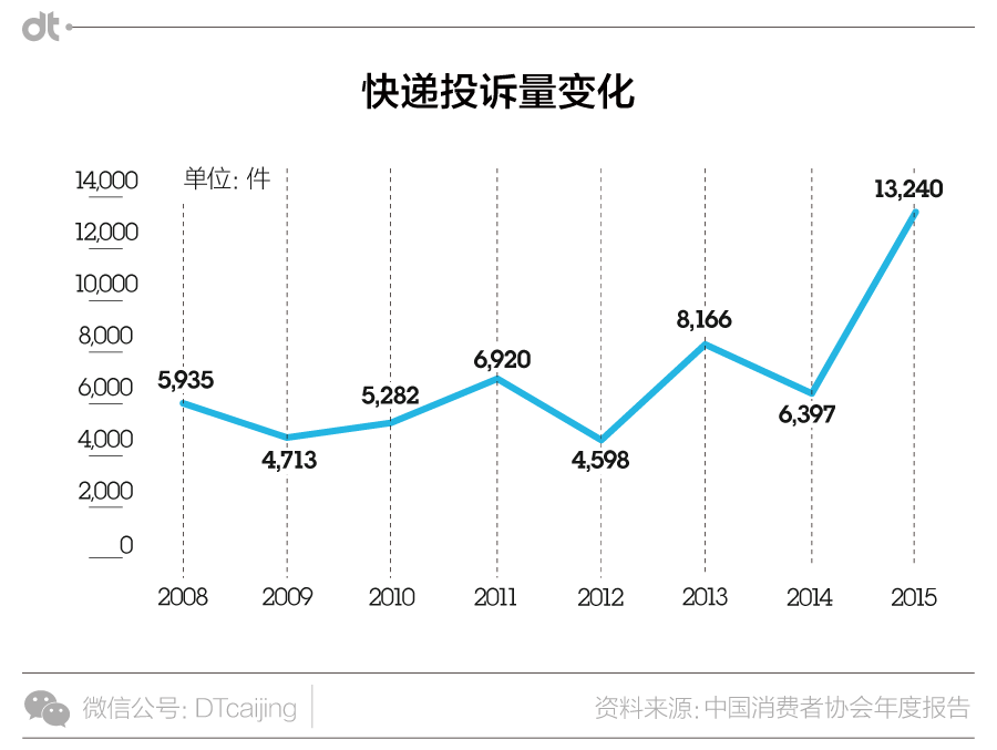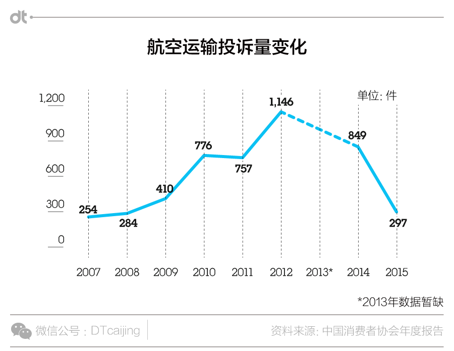 关于航空运输服务投诉量从2007年的254万起到2012年的1146起,呈显著增长趋势。之后投诉量开始回落,2015年投诉量为297万起。