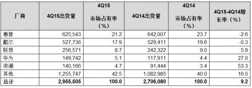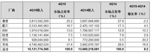 表一 2015年第四季度全球服务器厂商收入初步统计(单位:美元)