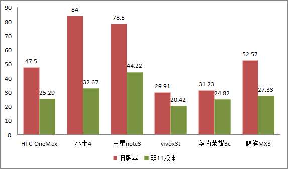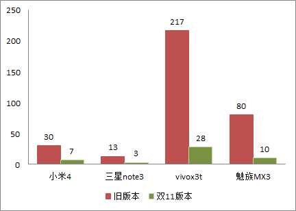 在双11版本上,针对一些热门机型在搜索结果页不断滚动使用,进行了不同版本的内存占用对比分析,如下图。可以看出,除华为3c和vivo这类系统内存偏小使用上一直受到控制、内存较为紧张的外,大部分机型内存的下降幅度都达到45%以上。