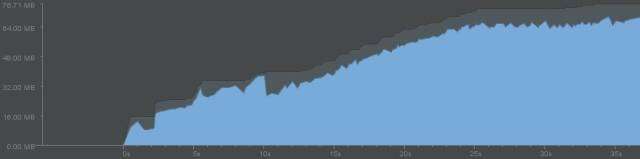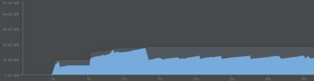 内存下降不是最终目的,最终要将GC对性能的影响降到最低。仍然以魅蓝note1打开首页后滑动到底的内存堆积图来做对比。可以看到旧版本内存占用上升趋势相当明显,一路带有各式“毛刺”直奔70MB,每形成一个毛刺就意味一次GC。而双11版本中,内存只在初期有上升,而后很快下降到21MB左右,后期也显得平滑得多,没有那么多的“毛刺”,就意味着GC发生的次数在明显减少。