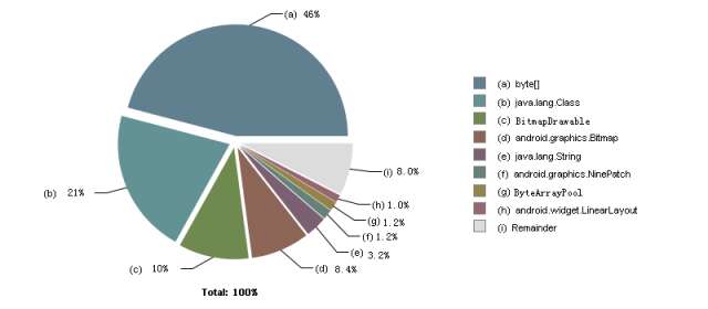 基于双11前的手淘Android版本,我们在魅蓝note1(4.4 OS)上滑动完首页后,dump出其Dalvik Heap,整体内存占用的分布情况如下图。可以看出,byte数组(a)占用空间最大,绝大多数是用来存放Bitmap的像素数据(Pixel Data)。另外(c)与(d)一起占用了18.4%, byte数组加上Bitmap、BitmapDrawable总共占用了64.4%,成为内存占用的主体。