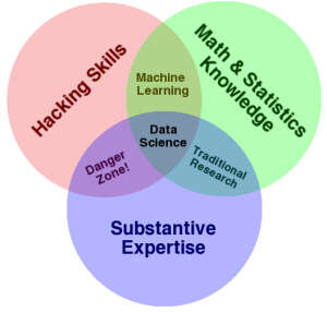 2010 年 9 月, Drew Conway 在《数据科学文恩图》( The Data Science Venn Diagram )写道:「…如果有人想成为一个完全称职的数据科学家,那需要学习很多东西。可惜的是,单纯例举文本和教材并无法缓解这种纠结。所以,出于简化讨论的考虑,以及把我个人的想法添加进这个已经很拥挤的思想集合中的考虑,我把数据科学文恩图呈现给大家…黑客技能,数学与统计知识和专业知识。」