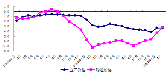 2014年以来工业生产者出厂价格和购进价格当月同比涨跌幅度(%)